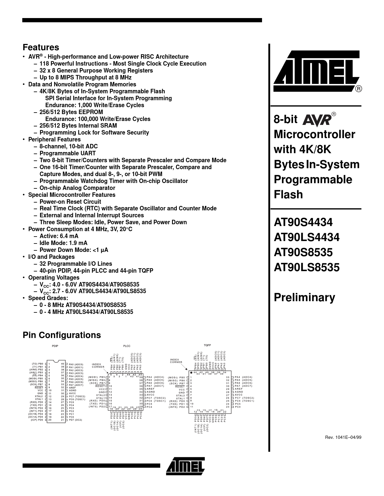 Datasheet AT90S4434, AT90LS4434, AT90S8535, AT90LS8535 - Preliminary Atmel
