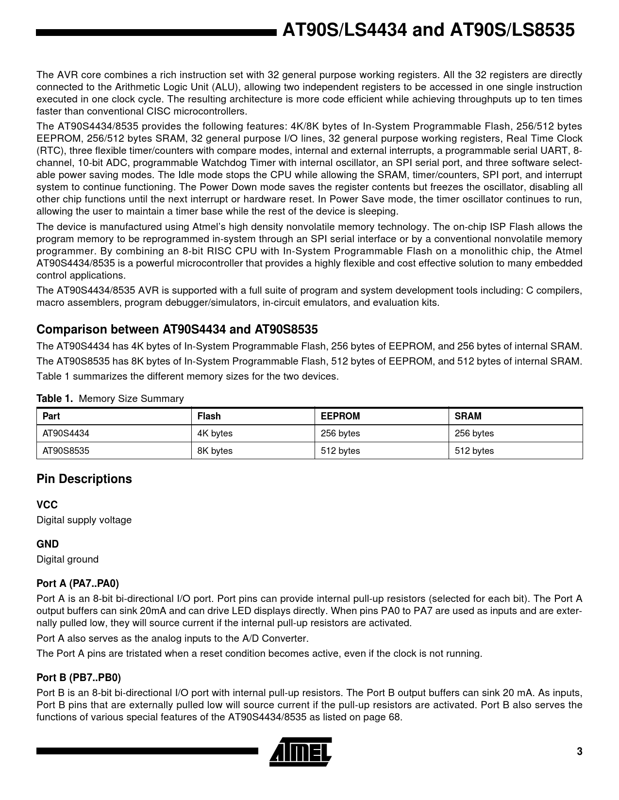 link to page 3 link to page 68 AT90S/LS4434 and AT90S/LS8535 The AVR core combines a rich instruction set with 32 general purpose working registers. All the 32 registers are directly connected to the Arithmetic Logic Unit (ALU), allowing two independent registers to be accessed in one single instruction executed in one clock cycle. The resulting architecture is more code efficient while achieving throughputs up to ten times faster than conventional CISC microcontrollers. The AT90S4434/8535 provides the following features: 4K/8K bytes of In-System Programmable Flash, 256/512 bytes EEPROM, 256/512 bytes SRAM, 32 general purpose I/O lines, 32 general purpose working registers, Real Time Clock (RTC), three flexible timer/counters with compare modes, internal and external interrupts, a programmable serial UART, 8- channel, 10-bit ADC, programmable Watchdog Timer with internal oscillator, an SPI serial port, and three software select- able power saving modes. The Idle mode stops the CPU while allowing the SRAM, timer/counters, SPI port, and interrupt system to continue functioning. The Power Down mode saves the register contents but freezes the oscillator, disabling all other chip functions until the next interrupt or hardware reset. In Power Save mode, the timer oscillator continues to run, allowing the user to maintain a timer base while the rest of the device is sleeping. The device is manufactured using Atmel’s high density nonvolatile memory technology. The on-chip ISP Flash allows the program memory to be reprogrammed in-system through an SPI serial interface or by a conventional nonvolatile memory programmer. By combining an 8-bit RISC CPU with In-System Programmable Flash on a monolithic chip, the Atmel AT90S4434/8535 is a powerful microcontroller that provides a highly flexible and cost effective solution to many embedded control applications. The AT90S4434/8535 AVR is supported with a full suite of program and system development tools including: C compilers, macro assemblers, program debugger/simulators, in-circuit emulators, and evaluation kits. Comparison between AT90S4434 and AT90S8535 The AT90S4434 has 4K bytes of In-System Programmable Flash, 256 bytes of EEPROM, and 256 bytes of internal SRAM. The AT90S8535 has 8K bytes of In-System Programmable Flash, 512 bytes of EEPROM, and 512 bytes of internal SRAM. Table 1 summarizes the different memory sizes for the two devices. Table 1. Memory Size Summary PartFlashEEPROMSRAM AT90S4434 4K bytes 256 bytes 256 bytes AT90S8535 8K bytes 512 bytes 512 bytes Pin DescriptionsVCC Digital supply voltage GND Digital ground Port A (PA7..PA0) Port A is an 8-bit bi-directional I/O port. Port pins can provide internal pull-up resistors (selected for each bit). The Port A output buffers can sink 20mA and can drive LED displays directly. When pins PA0 to PA7 are used as inputs and are exter- nally pulled low, they will source current if the internal pull-up resistors are activated. Port A also serves as the analog inputs to the A/D Converter. The Port A pins are tristated when a reset condition becomes active, even if the clock is not running. Port B (PB7..PB0) Port B is an 8-bit bi-directional I/O port with internal pull-up resistors. The Port B output buffers can sink 20 mA. As inputs, Port B pins that are externally pulled low will source current if the pull-up resistors are activated. Port B also serves the functions of various special features of the AT90S4434/8535 as listed on page 68. 3 Document Outline Features Description Block Diagram Comparison between AT90S4434 and AT90S8535 Pin Descriptions VCC GND Port A (PA7..PA0) Port B (PB7..PB0) Port C (PC7..PC0) Port D (PD7..PD0) RESET XTAL1 XTAL2 AVCC AREF AGND Clock Options Crystal Oscillator External Clock Timer Oscillator Architectural Overview General Purpose Register File X-register, Y-register And Z-register ALU - Arithmetic Logic Unit In-System Programmable Flash Program Memory SRAM Data Memory Program and Data Addressing Modes Register Direct, Single Register Rd Register Direct, Two Registers Rd And Rr I/O Direct Data Direct Data Indirect With Displacement Data Indirect Data Indirect With Pre-Decrement Data Indirect With Post-Increment Constant Addressing Using the LPM Instruction Indirect Program Addressing, IJMP and ICALL Relative Program Addressing, RJMP and RCALL EEPROM Data Memory Memory Access Times and Instruction Execution Timing I/O Memory Status Register - SREG Stack Pointer - SP Reset and Interrupt Handling Reset Sources Power-On Reset External Reset Watchdog Reset MCU Status Register - MCUSR Interrupt Handling General Interrupt Mask Register - GIMSK General Interrupt Flag Register - GIFR Timer/Counter Interrupt Mask Register - TIMSK Timer/Counter Interrupt Flag Register - TIFR External Interrupts Interrupt Response Time MCU Control Register - MCUCR Sleep Modes Idle Mode Power Down Mode Power Save Mode Timer / Counters Timer/Counter Prescalers 8-bit Timer/Counter0 Timer/Counter0 Control Register - TCCR0 Timer Counter 0 - TCNT0 16-bit Timer/Counter1 Timer/Counter1 Control Register A - TCCR1A Timer/Counter1 Control Register B - TCCR1B Timer/Counter1 - TCNT1H AND TCNT1L Timer/Counter1 Output Compare Register - OCR1AH AND OCR1AL Timer/Counter1 Output Compare Register - OCR1BH AND OCR1BL Timer/Counter1 Input Capture Register - ICR1H AND ICR1L Timer/Counter1 In PWM Mode 8-bit Timer/Counter 2 Timer/Counter2 Control Register - TCCR2 Timer/Counter2 - TCNT2 Timer/Counter2 Output Compare Register - OCR2 Timer/Counter 2 in PWM mode Asynchronous Status Register - ASSR Asynchronous Operation of Timer/Counter2 Watchdog Timer Watchdog Timer Control Register - WDTCR EEPROM Read/Write Access EEPROM Address Register - EEARH and EEARL EEPROM Data Register - EEDR EEPROM Control Register - EECR Prevent EEPROM Corruption Serial Peripheral Interface - SPI SS Pin Functionality Data Modes SPI Control Register - SPCR SPI Status Register - SPSR SPI Data Register - SPDR UART Data Transmission Data Receptio