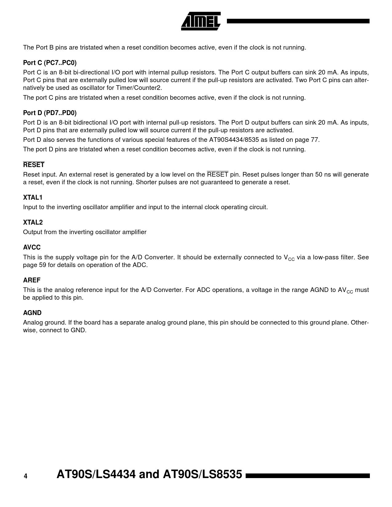 link to page 77 link to page 59 The Port B pins are tristated when a reset condition becomes active, even if the clock is not running. Port C (PC7..PC0) Port C is an 8-bit bi-directional I/O port with internal pullup resistors. The Port C output buffers can sink 20 mA. As inputs, Port C pins that are externally pulled low will source current if the pull-up resistors are activated. Two Port C pins can alter- natively be used as oscillator for Timer/Counter2. The port C pins are tristated when a reset condition becomes active, even if the clock is not running. Port D (PD7..PD0) Port D is an 8-bit bidirectional I/O port with internal pull-up resistors. The Port D output buffers can sink 20 mA. As inputs, Port D pins that are externally pulled low will source current if the pull-up resistors are activated. Port D also serves the functions of various special features of the AT90S4434/8535 as listed on page 77. The port D pins are tristated when a reset condition becomes active, even if the clock is not running. RESET Reset input. An external reset is generated by a low level on the RESET pin. Reset pulses longer than 50 ns will generate a reset, even if the clock is not running. Shorter pulses are not guaranteed to generate a reset. XTAL1 Input to the inverting oscillator amplifier and input to the internal clock operating circuit. XTAL2 Output from the inverting oscillator amplifier AVCC This is the supply voltage pin for the A/D Converter. It should be externally connected to VCC via a low-pass filter. See page 59 for details on operation of the ADC. AREF This is the analog reference input for the A/D Converter. For ADC operations, a voltage in the range AGND to AVCC must be applied to this pin. AGND Analog ground. If the board has a separate analog ground plane, this pin should be connected to this ground plane. Other- wise, connect to GND. 4AT90S/LS4434 and AT90S/LS8535 Document Outline Features Description Block Diagram Comparison between AT90S4434 and AT90S8535 Pin Descriptions VCC GND Port A (PA7..PA0) Port B (PB7..PB0) Port C (PC7..PC0) Port D (PD7..PD0) RESET XTAL1 XTAL2 AVCC AREF AGND Clock Options Crystal Oscillator External Clock Timer Oscillator Architectural Overview General Purpose Register File X-register, Y-register And Z-register ALU - Arithmetic Logic Unit In-System Programmable Flash Program Memory SRAM Data Memory Program and Data Addressing Modes Register Direct, Single Register Rd Register Direct, Two Registers Rd And Rr I/O Direct Data Direct Data Indirect With Displacement Data Indirect Data Indirect With Pre-Decrement Data Indirect With Post-Increment Constant Addressing Using the LPM Instruction Indirect Program Addressing, IJMP and ICALL Relative Program Addressing, RJMP and RCALL EEPROM Data Memory Memory Access Times and Instruction Execution Timing I/O Memory Status Register - SREG Stack Pointer - SP Reset and Interrupt Handling Reset Sources Power-On Reset External Reset Watchdog Reset MCU Status Register - MCUSR Interrupt Handling General Interrupt Mask Register - GIMSK General Interrupt Flag Register - GIFR Timer/Counter Interrupt Mask Register - TIMSK Timer/Counter Interrupt Flag Register - TIFR External Interrupts Interrupt Response Time MCU Control Register - MCUCR Sleep Modes Idle Mode Power Down Mode Power Save Mode Timer / Counters Timer/Counter Prescalers 8-bit Timer/Counter0 Timer/Counter0 Control Register - TCCR0 Timer Counter 0 - TCNT0 16-bit Timer/Counter1 Timer/Counter1 Control Register A - TCCR1A Timer/Counter1 Control Register B - TCCR1B Timer/Counter1 - TCNT1H AND TCNT1L Timer/Counter1 Output Compare Register - OCR1AH AND OCR1AL Timer/Counter1 Output Compare Register - OCR1BH AND OCR1BL Timer/Counter1 Input Capture Register - ICR1H AND ICR1L Timer/Counter1 In PWM Mode 8-bit Timer/Counter 2 Timer/Counter2 Control Register - TCCR2 Timer/Counter2 - TCNT2 Timer/Counter2 Output Compare Register - OCR2 Timer/Counter 2 in PWM mode Asynchronous Status Register - ASSR Asynchronous Operation of Timer/Counter2 Watchdog Timer Watchdog Timer Control Register - WDTCR EEPROM Read/Write Access EEPROM Address Register - EEARH and EEARL EEPROM Data Register - EEDR EEPROM Control Register - EECR Prevent EEPROM Corruption Serial Peripheral Interface - SPI SS Pin Functionality Data Modes SPI Control Register - SPCR SPI Status Register - SPSR SPI Data Register - SPDR UART Data Transmission Data Reception UART Control UART I/O Data Register - UDR UART Status Register - USR UART Control Register - UCR Baud Rate Generator UART Baud Rate Register - UBRR Analog Comparator Analog Comparator Control And Status Register - ACSR Analog to Digital Converter Operation Prescaling ADC Noise Canceler Function ADC Multiplexer Select Register - ADMUX ADC Control and Status Register - ADCSR ADC Data Register - ADCL AND ADCH Scanning Multiple Channels ADC Noise Canceling Techniques ADC Characteristics I/O-Ports Port A Port A Data Register - PORTA Port A Data Direction Register - DDRA Port A Input Pins Address - PINA Port A as General Digital I/O Port A Schematics Port B Port B Data Register - PORTB Port B Data Direction Register - DDRB Port B Input Pins Address - PINB Port B As General Digital I/O Alternate Functions Of Port B Port B Schematics Port C Port C Data Register - PORTC Port C Data Direction Register - DDRC Port C Input Pins Address - PINC Port C As General Digital I/O Alternate Functions of Port C Port C Schematics Port D Port D Data Register - PORTD Port D Data Direction Register - DDRD Port D Input Pins Address - PIND Port D As General Digital I/O Alternate Functions Of Port D Port D Schematics Memory Programming Program and Data Memory Lock Bits Fuse Bits Signature Bytes Programming the Flash and EEPROM Parallel Programming Signal Names Enter Programming Mode Chip Erase Programming the Flash Reading the Flash Programming the EEPROM Reading the EEPROM Programming the Fuse Bits Programming the Lock Bits Reading the Fuse and Lock Bits Reading the Signature Bytes Parallel Pr