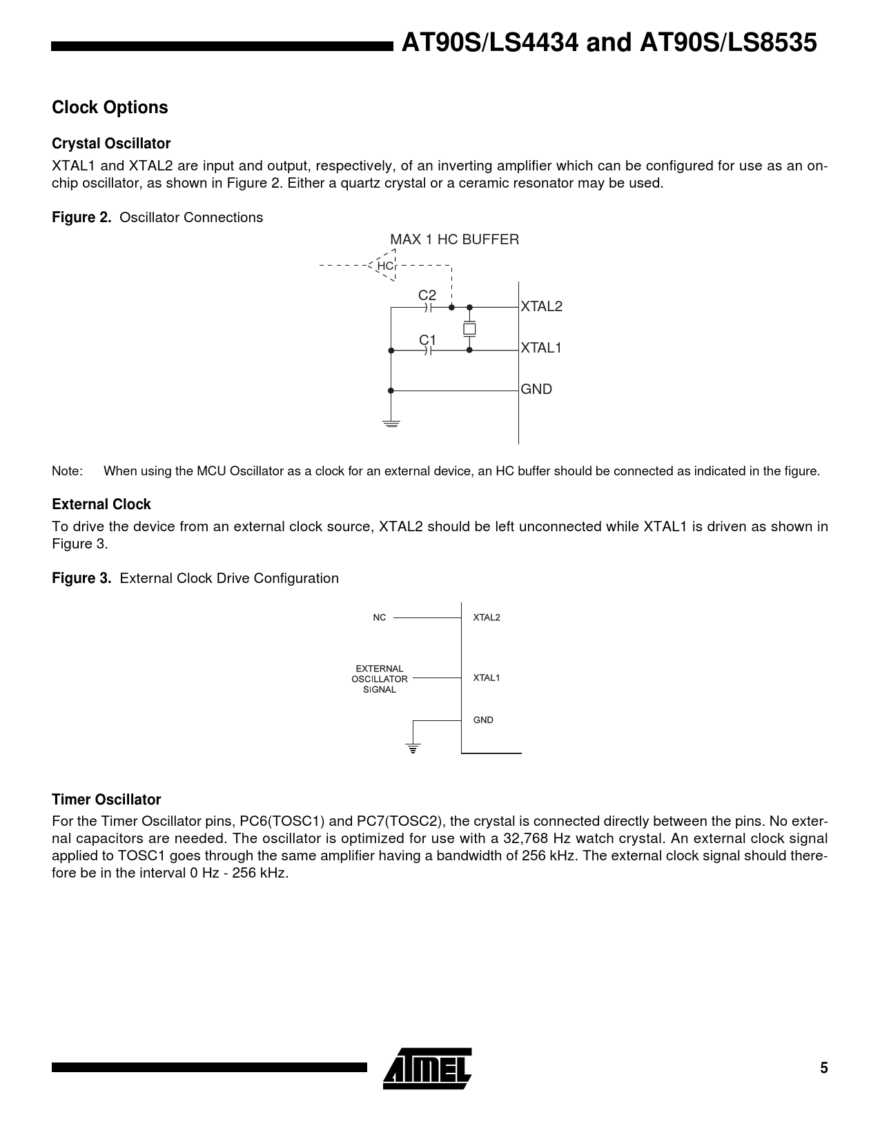 link to page 5 link to page 5 AT90S/LS4434 and AT90S/LS8535Clock OptionsCrystal Oscillator XTAL1 and XTAL2 are input and output, respectively, of an inverting amplifier which can be configured for use as an on- chip oscillator, as shown in Figure 2. Either a quartz crystal or a ceramic resonator may be used. Figure 2. Oscillator Connections MAX 1 HC BUFFER HC C2 XTAL2 C1 XTAL1 GND Note: When using the MCU Oscillator as a clock for an external device, an HC buffer should be connected as indicated in the figure. External Clock To drive the device from an external clock source, XTAL2 should be left unconnected while XTAL1 is driven as shown in Figure 3. Figure 3. External Clock Drive Configuration Timer Oscillator For the Timer Oscillator pins, PC6(TOSC1) and PC7(TOSC2), the crystal is connected directly between the pins. No exter- nal capacitors are needed. The oscillator is optimized for use with a 32,768 Hz watch crystal. An external clock signal applied to TOSC1 goes through the same amplifier having a bandwidth of 256 kHz. The external clock signal should there- fore be in the interval 0 Hz - 256 kHz. 5 Document Outline Features Description Block Diagram Comparison between AT90S4434 and AT90S8535 Pin Descriptions VCC GND Port A (PA7..PA0) Port B (PB7..PB0) Port C (PC7..PC0) Port D (PD7..PD0) RESET XTAL1 XTAL2 AVCC AREF AGND Clock Options Crystal Oscillator External Clock Timer Oscillator Architectural Overview General Purpose Register File X-register, Y-register And Z-register ALU - Arithmetic Logic Unit In-System Programmable Flash Program Memory SRAM Data Memory Program and Data Addressing Modes Register Direct, Single Register Rd Register Direct, Two Registers Rd And Rr I/O Direct Data Direct Data Indirect With Displacement Data Indirect Data Indirect With Pre-Decrement Data Indirect With Post-Increment Constant Addressing Using the LPM Instruction Indirect Program Addressing, IJMP and ICALL Relative Program Addressing, RJMP and RCALL EEPROM Data Memory Memory Access Times and Instruction Execution Timing I/O Memory Status Register - SREG Stack Pointer - SP Reset and Interrupt Handling Reset Sources Power-On Reset External Reset Watchdog Reset MCU Status Register - MCUSR Interrupt Handling General Interrupt Mask Register - GIMSK General Interrupt Flag Register - GIFR Timer/Counter Interrupt Mask Register - TIMSK Timer/Counter Interrupt Flag Register - TIFR External Interrupts Interrupt Response Time MCU Control Register - MCUCR Sleep Modes Idle Mode Power Down Mode Power Save Mode Timer / Counters Timer/Counter Prescalers 8-bit Timer/Counter0 Timer/Counter0 Control Register - TCCR0 Timer Counter 0 - TCNT0 16-bit Timer/Counter1 Timer/Counter1 Control Register A - TCCR1A Timer/Counter1 Control Register B - TCCR1B Timer/Counter1 - TCNT1H AND TCNT1L Timer/Counter1 Output Compare Register - OCR1AH AND OCR1AL Timer/Counter1 Output Compare Register - OCR1BH AND OCR1BL Timer/Counter1 Input Capture Register - ICR1H AND ICR1L Timer/Counter1 In PWM Mode 8-bit Timer/Counter 2 Timer/Counter2 Control Register - TCCR2 Timer/Counter2 - TCNT2 Timer/Counter2 Output Compare Register - OCR2 Timer/Counter 2 in PWM mode Asynchronous Status Register - ASSR Asynchronous Operation of Timer/Counter2 Watchdog Timer Watchdog Timer Control Register - WDTCR EEPROM Read/Write Access EEPROM Address Register - EEARH and EEARL EEPROM Data Register - EEDR EEPROM Control Register - EECR Prevent EEPROM Corruption Serial Peripheral Interface - SPI SS Pin Functionality Data Modes SPI Control Register - SPCR SPI Status Register - SPSR SPI Data Register - SPDR UART Data Transmission Data Reception UART Control UART I/O Data Register - UDR UART Status Register - USR UART Control Register - UCR Baud Rate Generator UART Baud Rate Register - UBRR Analog Comparator Analog Comparator Control And Status Register - ACSR Analog to Digital Converter Operation Prescaling ADC Noise Canceler Function ADC Multiplexer Select Register - ADMUX ADC Control and Status Register - ADCSR ADC Data Register - ADCL AND ADCH Scanning Multiple Channels ADC Noise Canceling Techniques ADC Characteristics I/O-Ports Port A Port A Data Register - PORTA Port A Data Direction Register - DDRA Port A Input Pins Address - PINA Port A as General Digital I/O Port A Schematics Port B Port B Data Register - PORTB Port B Data Direction Register - DDRB Port B Input Pins Address - PINB Port B As General Digital I/O Alternate Functions Of Port B Port B Schematics Port C Port C Data Register - PORTC Port C Data Direction Register - DDRC Port C Input Pins Address - PINC Port C As General Digital I/O Alternate Functions of Port C Port C Schematics Port D Port D Data Register - PORTD Port D Data Direction Register - DDRD Port D Input Pins Address - PIND Port D As General Digital I/O Alternate Functions Of Port D Port D Schematics Memory Programming Program and Data Memory Lock Bits Fuse Bits Signature Bytes Programming the Flash and EEPROM Parallel Programming Signal Names Enter Programming Mode Chip Erase Programming the Flash Reading the Flash Programming the EEPROM Reading the EEPROM Programming the Fuse Bits Programming the Lock Bits Reading the Fuse and Lock Bits Reading the Signature Bytes Parallel Programming Characteristics Serial Downloading Serial Programming Algorithm Data Polling EEPROM Data Polling Flash Serial Programming Characteristics Electrical Characteristics Absolute Maximum Ratings* DC Characteristics External Clock Drive Waveforms Typical Characteristics Register Summary (Continued) Instruction Set Summary (Continued) Ordering Information Pin Configurations