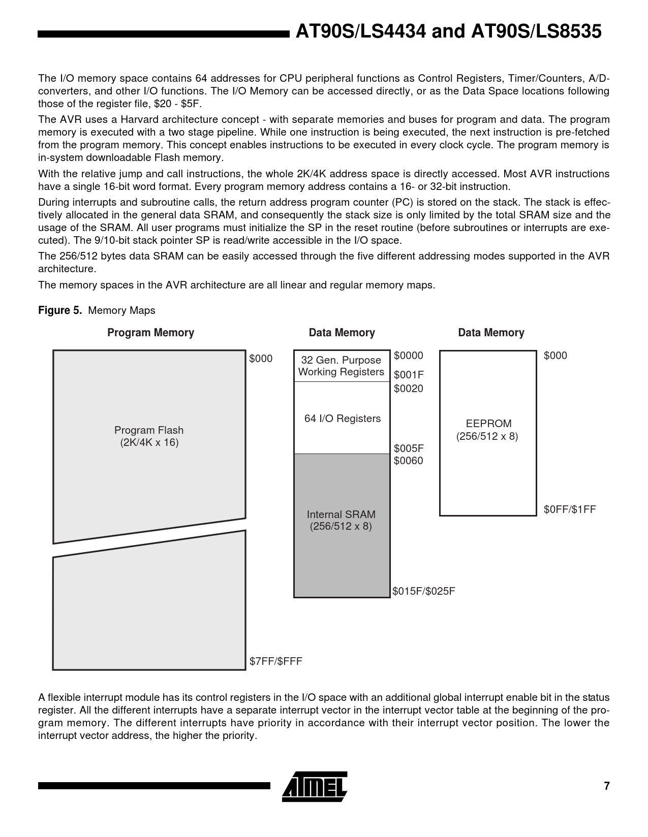 AT90S/LS4434 and AT90S/LS8535 The I/O memory space contains 64 addresses for CPU peripheral functions as Control Registers, Timer/Counters, A/D- converters, and other I/O functions. The I/O Memory can be accessed directly, or as the Data Space locations following those of the register file, $20 - $5F. The AVR uses a Harvard architecture concept - with separate memories and buses for program and data. The program memory is executed with a two stage pipeline. While one instruction is being executed, the next instruction is pre-fetched from the program memory. This concept enables instructions to be executed in every clock cycle. The program memory is in-system downloadable Flash memory. With the relative jump and call instructions, the whole 2K/4K address space is directly accessed. Most AVR instructions have a single 16-bit word format. Every program memory address contains a 16- or 32-bit instruction. During interrupts and subroutine calls, the return address program counter (PC) is stored on the stack. The stack is effec- tively allocated in the general data SRAM, and consequently the stack size is only limited by the total SRAM size and the usage of the SRAM. All user programs must initialize the SP in the reset routine (before subroutines or interrupts are exe- cuted). The 9/10-bit stack pointer SP is read/write accessible in the I/O space. The 256/512 bytes data SRAM can be easily accessed through the five different addressing modes supported in the AVR architecture. The memory spaces in the AVR architecture are all linear and regular memory maps. Figure 5. Memory Maps Program MemoryData MemoryData Memory $000 32 Gen. Purpose $0000 $000 Working Registers $001F $0020 64 I/O Registers EEPROM Program Flash (256/512 x 8) (2K/4K x 16) $005F $0060 $0FF/$1FF Internal SRAM (256/512 x 8) $015F/$025F $7FF/$FFF A flexible interrupt module has its control registers in the I/O space with an additional global interrupt enable bit in the status register. All the different interrupts have a separate interrupt vector in the interrupt vector table at the beginning of the pro- gram memory. The different interrupts have priority in accordance with their interrupt vector position. The lower the interrupt vector address, the higher the priority. 7 Document Outline Features Description Block Diagram Comparison between AT90S4434 and AT90S8535 Pin Descriptions VCC GND Port A (PA7..PA0) Port B (PB7..PB0) Port C (PC7..PC0) Port D (PD7..PD0) RESET XTAL1 XTAL2 AVCC AREF AGND Clock Options Crystal Oscillator External Clock Timer Oscillator Architectural Overview General Purpose Register File X-register, Y-register And Z-register ALU - Arithmetic Logic Unit In-System Programmable Flash Program Memory SRAM Data Memory Program and Data Addressing Modes Register Direct, Single Register Rd Register Direct, Two Registers Rd And Rr I/O Direct Data Direct Data Indirect With Displacement Data Indirect Data Indirect With Pre-Decrement Data Indirect With Post-Increment Constant Addressing Using the LPM Instruction Indirect Program Addressing, IJMP and ICALL Relative Program Addressing, RJMP and RCALL EEPROM Data Memory Memory Access Times and Instruction Execution Timing I/O Memory Status Register - SREG Stack Pointer - SP Reset and Interrupt Handling Reset Sources Power-On Reset External Reset Watchdog Reset MCU Status Register - MCUSR Interrupt Handling General Interrupt Mask Register - GIMSK General Interrupt Flag Register - GIFR Timer/Counter Interrupt Mask Register - TIMSK Timer/Counter Interrupt Flag Register - TIFR External Interrupts Interrupt Response Time MCU Control Register - MCUCR Sleep Modes Idle Mode Power Down Mode Power Save Mode Timer / Counters Timer/Counter Prescalers 8-bit Timer/Counter0 Timer/Counter0 Control Register - TCCR0 Timer Counter 0 - TCNT0 16-bit Timer/Counter1 Timer/Counter1 Control Register A - TCCR1A Timer/Counter1 Control Register B - TCCR1B Timer/Counter1 - TCNT1H AND TCNT1L Timer/Counter1 Output Compare Register - OCR1AH AND OCR1AL Timer/Counter1 Output Compare Register - OCR1BH AND OCR1BL Timer/Counter1 Input Capture Register - ICR1H AND ICR1L Timer/Counter1 In PWM Mode 8-bit Timer/Counter 2 Timer/Counter2 Control Register - TCCR2 Timer/Counter2 - TCNT2 Timer/Counter2 Output Compare Register - OCR2 Timer/Counter 2 in PWM mode Asynchronous Status Register - ASSR Asynchronous Operation of Timer/Counter2 Watchdog Timer Watchdog Timer Control Register - WDTCR EEPROM Read/Write Access EEPROM Address Register - EEARH and EEARL EEPROM Data Register - EEDR EEPROM Control Register - EECR Prevent EEPROM Corruption Serial Peripheral Interface - SPI SS Pin Functionality Data Modes SPI Control Register - SPCR SPI Status Register - SPSR SPI Data Register - SPDR UART Data Transmission Data Reception UART Control UART I/O Data Register - UDR UART Status Register - USR UART Control Register - UCR Baud Rate Generator UART Baud Rate Register - UBRR Analog Comparator Analog Comparator Control And Status Register - ACSR Analog to Digital Converter Operation Prescaling ADC Noise Canceler Function ADC Multiplexer Select Register - ADMUX ADC Control and Status Register - ADCSR ADC Data Register - ADCL AND ADCH Scanning Multiple Channels ADC Noise Canceling Techniques ADC Characteristics I/O-Ports Port A Port A Data Register - PORTA Port A Data Direction Register - DDRA Port A Input Pins Address - PINA Port A as General Digital I/O Port A Schematics Port B Port B Data Register - PORTB Port B Data Direction Register - DDRB Port B Input Pins Address - PINB Port B As General Digital I/O Alternate Functions Of Port B Port B Schematics Port C Port C Data Register - PORTC Port C Data Direction Register - DDRC Port C Input Pins Address - PINC Port C As General Digital I/O Alternate Functions of Port C Port C Schematics Port D Port D Data Register - PORTD Port D Data Direction Register - DDRD Port D Input Pins Address - PIND Port D As General Digital I/O Alternate Functions Of Port D Port D Schematics Memory Programmi