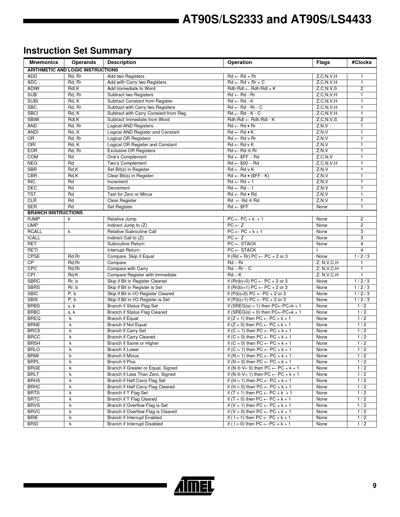 AT90S/LS2333 and AT90S/LS4433. Instruction Set Summary. Mnemonics. Operands. Description. Operation. Flags. #Clocks