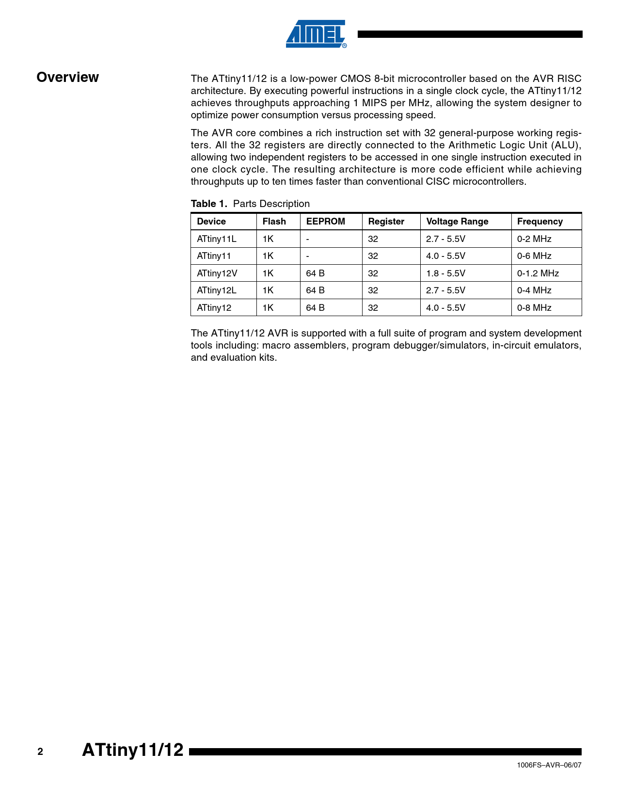 Overview The ATtiny11/12 is a low-power CMOS 8-bit microcontroller based on the AVR RISC architecture. By executing powerful instructions in a single clock cycle, the ATtiny11/12 achieves throughputs approaching 1 MIPS per MHz, allowing the system designer to optimize power consumption versus processing speed. The AVR core combines a rich instruction set with 32 general-purpose working regis- ters. All the 32 registers are directly connected to the Arithmetic Logic Unit (ALU), allowing two independent registers to be accessed in one single instruction executed in one clock cycle. The resulting architecture is more code efficient while achieving throughputs up to ten times faster than conventional CISC microcontrollers. Table 1. Parts Description DeviceFlashEEPROMRegisterVoltage RangeFrequency ATtiny11L 1K - 32 2.7 - 5.5V 0-2 MHz ATtiny11 1K - 32 4.0 - 5.5V 0-6 MHz ATtiny12V 1K 64 B 32 1.8 - 5.5V 0-1.2 MHz ATtiny12L 1K 64 B 32 2.7 - 5.5V 0-4 MHz ATtiny12 1K 64 B 32 4.0 - 5.5V 0-8 MHz The ATtiny11/12 AVR is supported with a full suite of program and system development tools including: macro assemblers, program debugger/simulators, in-circuit emulators, and evaluation kits. 2ATtiny11/12 1006FS–AVR–06/07 Document Outline Features Pin Configuration Overview ATtiny11 Block Diagram ATtiny12 Block Diagram Pin Descriptions VCC GND Port B (PB5..PB0) XTAL1 XTAL2 RESET Register Summary ATtiny11 Register Summary ATtiny12 Instruction Set Summary Ordering Information ATtiny11 ATtiny12 Packaging Information 8P3 8S2 Datasheet Revision History Rev. 1006F-06/07 Rev. 1006E-07/06 Rev. 1006D-07/03 Rev. 1006C-09/01
