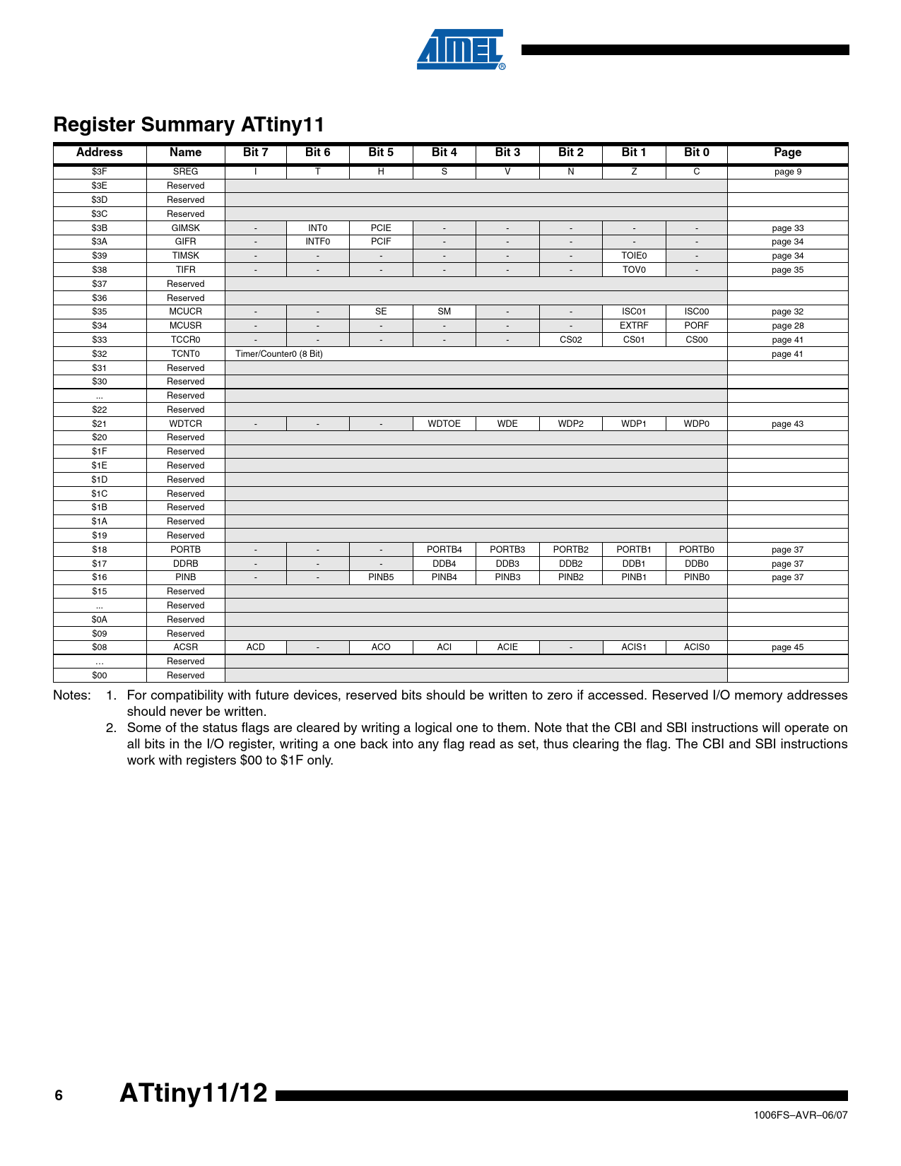 Register Summary ATtiny11. Address. Name. Bit 7. Bit 6. Bit 5. Bit 4. Bit 3. Bit 2. Bit 1. Bit 0. Page. ATtiny11/12