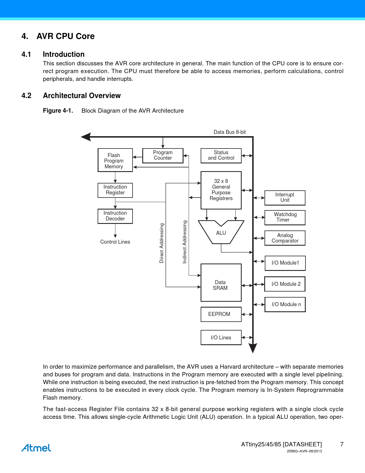 4.AVR CPU Core4.1Introduction This section discusses the AVR core architecture in general. The main function of the CPU core is to ensure cor- rect program execution. The CPU must therefore be able to access memories, perform calculations, control peripherals, and handle interrupts. 4.2Architectural OverviewFigure 4-1. Block Diagram of the AVR Architecture Data Bus 8-bit Program Status Flash Counter and Control Program Memory 32 x 8 Instruction General Register Purpose Interrupt Registrers Unit Instruction Watchdog Decoder Timer ALU Analog Control Lines Comparator Direct Addressing Indirect Addressing I/O Module1 Data I/O Module 2 SRAM I/O Module n EEPROM I/O Lines In order to maximize performance and parallelism, the AVR uses a Harvard architecture – with separate memories and buses for program and data. Instructions in the Program memory are executed with a single level pipelining. While one instruction is being executed, the next instruction is pre-fetched from the Program memory. This concept enables instructions to be executed in every clock cycle. The Program memory is In-System Reprogrammable Flash memory. The fast-access Register File contains 32 x 8-bit general purpose working registers with a single clock cycle access time. This allows single-cycle Arithmetic Logic Unit (ALU) operation. In a typical ALU operation, two oper- ATtiny25/45/85 [DATASHEET] 7 2586Q–AVR–08/2013 Document Outline Features 1. Pin Configurations 1.1 Pin Descriptions 1.1.1 VCC 1.1.2 GND 1.1.3 Port B (PB5:PB0) 1.1.4 RESET 2. Overview 2.1 Block Diagram 3. About 3.1 Resources 3.2 Code Examples 3.3 Capacitive Touch Sensing 3.4 Data Retention 4. AVR CPU Core 4.1 Introduction 4.2 Architectural Overview 4.3 ALU – Arithmetic Logic Unit 4.4 Status Register 4.4.1 SREG – AVR Status Register 4.5 General Purpose Register File 4.5.1 The X-register, Y-register, and Z-register 4.6 Stack Pointer 4.6.1 SPH and SPL — Stack Pointer Register 4.7 Instruction Execution Timing 4.8 Reset and Interrupt Handling 4.8.1 Interrupt Response Time 5. AVR Memories 5.1 In-System Re-programmable Flash Program Memory 5.2 SRAM Data Memory 5.2.1 Data Memory Access Times 5.3 EEPROM Data Memory 5.3.1 EEPROM Read/Write Access 5.3.2 Atomic Byte Programming 5.3.3 Split Byte Programming 5.3.4 Erase 5.3.5 Write 5.3.6 Preventing EEPROM Corruption 5.4 I/O Memory 5.5 Register Description 5.5.1 EEARH – EEPROM Address Register 5.5.2 EEARL – EEPROM Address Register 5.5.3 EEDR – EEPROM Data Register 5.5.4 EECR – EEPROM Control Register 6. System Clock and Clock Options 6.1 Clock Systems and their Distribution 6.1.1 CPU Clock – clkCPU 6.1.2 I/O Clock – clkI/O 6.1.3 Flash Clock – clkFLASH 6.1.4 ADC Clock – clkADC 6.1.5 Internal PLL for Fast Peripheral Clock Generation - clkPCK 6.1.6 Internal PLL in ATtiny15 Compatibility Mode 6.2 Clock Sources 6.2.1 External Clock 6.2.2 High Frequency PLL Clock 6.2.3 Calibrated Internal Oscillator 6.2.4 Internal 128 kHz Oscillator 6.2.5 Low-Frequency Crystal Oscillator 6.2.6 Crystal Oscillator / Ceramic Resonator 6.2.7 Default Clock Source 6.3 System Clock Prescaler 6.3.1 Switching Time 6.4 Clock Output Buffer 6.5 Register Description 6.5.1 OSCCAL – Oscillator Calibration Register 6.5.2 CLKPR – Clock Prescale Register 7. Power Management and Sleep Modes 7.1 Sleep Modes 7.1.1 Idle Mode 7.1.2 ADC Noise Reduction Mode 7.1.3 Power-down Mode 7.2 Software BOD Disable 7.2.1 Limitations 7.3 Power Reduction Register 7.4 Minimizing Power Consumption 7.4.1 Analog to Digital Converter 7.4.2 Analog Comparator 7.4.3 Brown-out Detector 7.4.4 Internal Voltage Reference 7.4.5 Watchdog Timer 7.4.6 Port Pins 7.5 Register Description 7.5.1 MCUCR – MCU Control Register 7.5.2 PRR – Power Reduction Register 8. System Control and Reset 8.1 Resetting the AVR 8.2 Reset Sources 8.2.1 Power-on Reset 8.2.2 External Reset 8.2.3 Brown-out Detection 8.2.4 Watchdog Reset 8.3 Internal Voltage Reference 8.3.1 Voltage Reference Enable Signals and Start-up Time 8.4 Watchdog Timer 8.4.1 Timed Sequences for Changing the Configuration of the Watchdog Timer 8.4.1.1 Safety Level 1 8.4.1.2 Safety Level 2 8.4.2 Code Example 8.5 Register Description 8.5.1 MCUSR – MCU Status Register 8.5.2 WDTCR – Watchdog Timer Control Register 9. Interrupts 9.1 Interrupt Vectors in ATtiny25/45/85 9.2 External Interrupts 9.2.1 Low Level Interrupt 9.2.2 Pin Change Interrupt Timing 9.3 Register Description 9.3.1 MCUCR – MCU Control Register 9.3.2 GIMSK – General Interrupt Mask Register 9.3.3 GIFR – General Interrupt Flag Register 9.3.4 PCMSK – Pin Change Mask Register 10. I/O Ports 10.1 Introduction 10.2 Ports as General Digital I/O 10.2.1 Configuring the Pin 10.2.2 Toggling the Pin 10.2.3 Switching Between Input and Output 10.2.4 Reading the Pin Value 10.2.5 Digital Input Enable and Sleep Modes 10.2.6 Unconnected Pins 10.3 Alternate Port Functions 10.3.1 Alternate Functions of Port B 10.4 Register Description 10.4.1 MCUCR – MCU Control Register 10.4.2 PORTB – Port B Data Register 10.4.3 DDRB – Port B Data Direction Register 10.4.4 PINB – Port B Input Pins Address 11. 8-bit Timer/Counter0 with PWM 11.1 Features 11.2 Overview 11.2.1 Registers 11.2.2 Definitions 11.3 Timer/Counter0 Prescaler and Clock Sources 11.3.1 Internal Clock Source with Prescaler 11.3.2 Prescaler Reset 11.3.3 External Clock Source 11.4 Counter Unit 11.5 Output Compare Unit 11.5.1 Force Output Compare 11.5.2 Compare Match Blocking by TCNT0 Write 11.5.3 Using the Output Compare Unit 11.6 Compare Match Output Unit 11.6.1 Compare Output Mode and Waveform Generation 11.7 Modes of Operation 11.7.1 Normal Mode 11.7.2 Clear Timer on Compare Match (CTC) Mode 11.7.3 Fast PWM Mode 11.7.4 Phase Correct PWM Mode 11.8 Timer/Counter Timing Diagrams 11.9 Register Description 11.9.1 GTCCR – General Timer/Counter Control Register 11.9.2 TCCR0A – Timer/Counter Control Register A 11.9.3 TCCR0B – Timer/Counter Control Register B 11.9.4 TCNT0 – Timer/Counter Register 11.9.5 OCR0