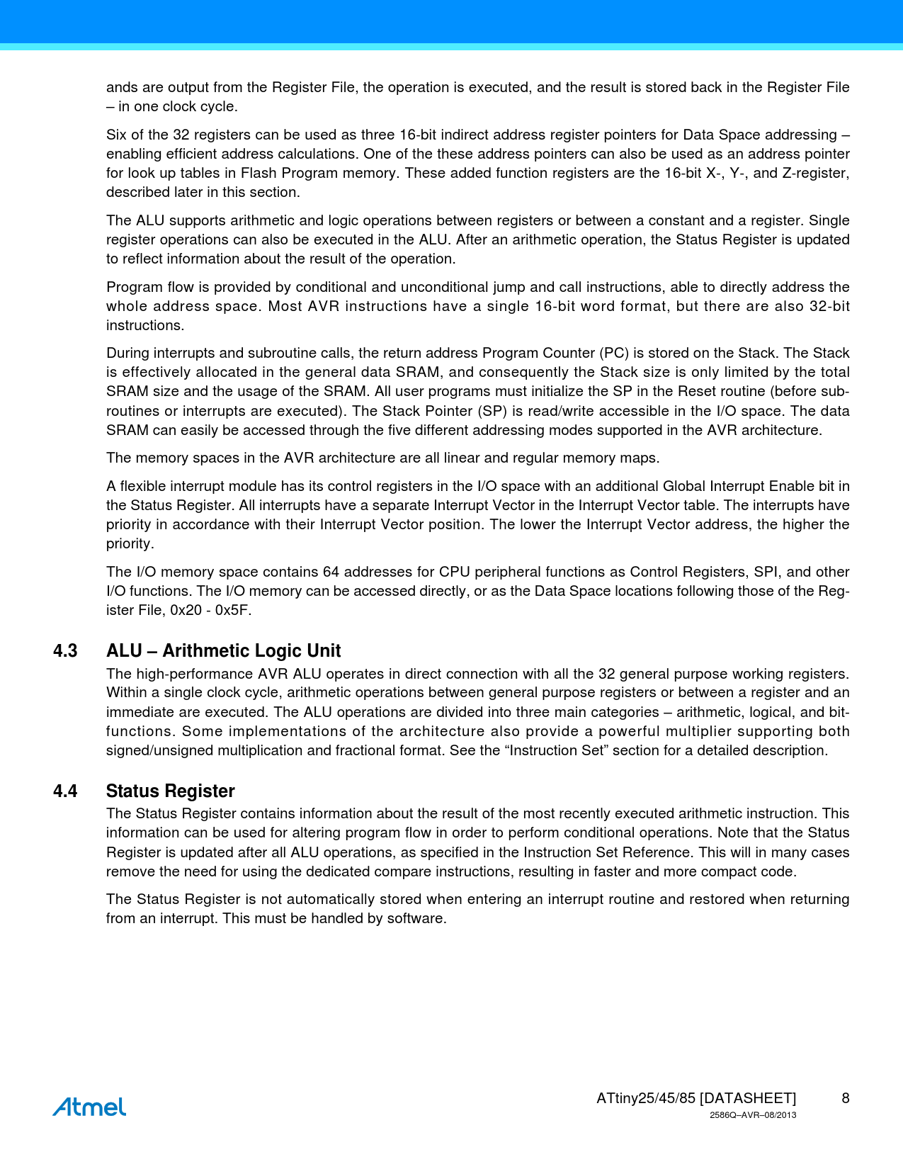 ands are output from the Register File, the operation is executed, and the result is stored back in the Register File – in one clock cycle. Six of the 32 registers can be used as three 16-bit indirect address register pointers for Data Space addressing – enabling efficient address calculations. One of the these address pointers can also be used as an address pointer for look up tables in Flash Program memory. These added function registers are the 16-bit X-, Y-, and Z-register, described later in this section. The ALU supports arithmetic and logic operations between registers or between a constant and a register. Single register operations can also be executed in the ALU. After an arithmetic operation, the Status Register is updated to reflect information about the result of the operation. Program flow is provided by conditional and unconditional jump and call instructions, able to directly address the whole address space. Most AVR instructions have a single 16-bit word format, but there are also 32-bit instructions. During interrupts and subroutine calls, the return address Program Counter (PC) is stored on the Stack. The Stack is effectively allocated in the general data SRAM, and consequently the Stack size is only limited by the total SRAM size and the usage of the SRAM. All user programs must initialize the SP in the Reset routine (before sub- routines or interrupts are executed). The Stack Pointer (SP) is read/write accessible in the I/O space. The data SRAM can easily be accessed through the five different addressing modes supported in the AVR architecture. The memory spaces in the AVR architecture are all linear and regular memory maps. A flexible interrupt module has its control registers in the I/O space with an additional Global Interrupt Enable bit in the Status Register. All interrupts have a separate Interrupt Vector in the Interrupt Vector table. The interrupts have priority in accordance with their Interrupt Vector position. The lower the Interrupt Vector address, the higher the priority. The I/O memory space contains 64 addresses for CPU peripheral functions as Control Registers, SPI, and other I/O functions. The I/O memory can be accessed directly, or as the Data Space locations following those of the Reg- ister File, 0x20 - 0x5F. 4.3ALU – Arithmetic Logic Unit The high-performance AVR ALU operates in direct connection with all the 32 general purpose working registers. Within a single clock cycle, arithmetic operations between general purpose registers or between a register and an immediate are executed. The ALU operations are divided into three main categories – arithmetic, logical, and bit- functions. Some implementations of the architecture also provide a powerful multiplier supporting both signed/unsigned multiplication and fractional format. See the “Instruction Set” section for a detailed description. 4.4Status Register The Status Register contains information about the result of the most recently executed arithmetic instruction. This information can be used for altering program flow in order to perform conditional operations. Note that the Status Register is updated after all ALU operations, as specified in the Instruction Set Reference. This will in many cases remove the need for using the dedicated compare instructions, resulting in faster and more compact code. The Status Register is not automatically stored when entering an interrupt routine and restored when returning from an interrupt. This must be handled by software. ATtiny25/45/85 [DATASHEET] 8 2586Q–AVR–08/2013 Document Outline Features 1. Pin Configurations 1.1 Pin Descriptions 1.1.1 VCC 1.1.2 GND 1.1.3 Port B (PB5:PB0) 1.1.4 RESET 2. Overview 2.1 Block Diagram 3. About 3.1 Resources 3.2 Code Examples 3.3 Capacitive Touch Sensing 3.4 Data Retention 4. AVR CPU Core 4.1 Introduction 4.2 Architectural Overview 4.3 ALU – Arithmetic Logic Unit 4.4 Status Register 4.4.1 SREG – AVR Status Register 4.5 General Purpose Register File 4.5.1 The X-register, Y-register, and Z-register 4.6 Stack Pointer 4.6.1 SPH and SPL — Stack Pointer Register 4.7 Instruction Execution Timing 4.8 Reset and Interrupt Handling 4.8.1 Interrupt Response Time 5. AVR Memories 5.1 In-System Re-programmable Flash Program Memory 5.2 SRAM Data Memory 5.2.1 Data Memory Access Times 5.3 EEPROM Data Memory 5.3.1 EEPROM Read/Write Access 5.3.2 Atomic Byte Programming 5.3.3 Split Byte Programming 5.3.4 Erase 5.3.5 Write 5.3.6 Preventing EEPROM Corruption 5.4 I/O Memory 5.5 Register Description 5.5.1 EEARH – EEPROM Address Register 5.5.2 EEARL – EEPROM Address Register 5.5.3 EEDR – EEPROM Data Register 5.5.4 EECR – EEPROM Control Register 6. System Clock and Clock Options 6.1 Clock Systems and their Distribution 6.1.1 CPU Clock – clkCPU 6.1.2 I/O Clock – clkI/O 6.1.3 Flash Clock – clkFLASH 6.1.4 ADC Clock – clkADC 6.1.5 Internal PLL for Fast Peripheral Clock Generation - clkPCK 6.1.6 Internal PLL in ATtiny15 Compatibility Mode 6.2 Clock Sources 6.2.1 External Clock 6.2.2 High Frequency PLL Clock 6.2.3 Calibrated Internal Oscillator 6.2.4 Internal 128 kHz Oscillator 6.2.5 Low-Frequency Crystal Oscillator 6.2.6 Crystal Oscillator / Ceramic Resonator 6.2.7 Default Clock Source 6.3 System Clock Prescaler 6.3.1 Switching Time 6.4 Clock Output Buffer 6.5 Register Description 6.5.1 OSCCAL – Oscillator Calibration Register 6.5.2 CLKPR – Clock Prescale Register 7. Power Management and Sleep Modes 7.1 Sleep Modes 7.1.1 Idle Mode 7.1.2 ADC Noise Reduction Mode 7.1.3 Power-down Mode 7.2 Software BOD Disable 7.2.1 Limitations 7.3 Power Reduction Register 7.4 Minimizing Power Consumption 7.4.1 Analog to Digital Converter 7.4.2 Analog Comparator 7.4.3 Brown-out Detector 7.4.4 Internal Voltage Reference 7.4.5 Watchdog Timer 7.4.6 Port Pins 7.5 Register Description 7.5.1 MCUCR – MCU Control Register 7.5.2 PRR – Power Reduction Register 8. System Control and Reset 8.1 Resetting the AVR 8.2 Reset Sources 8.2.1 Power-on 