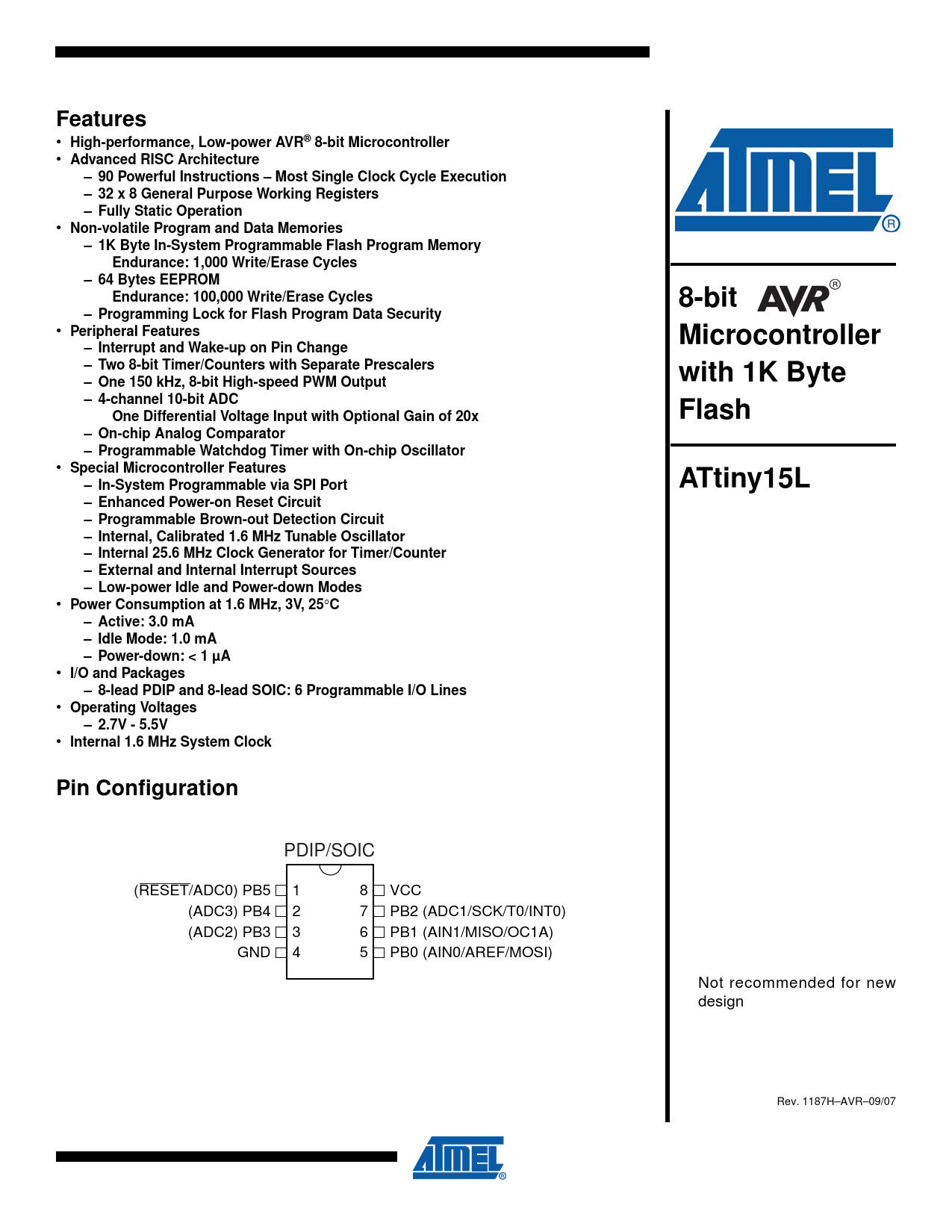 PDIP/SOIC (RESET/ADC0) PB5 1 8 VCC (ADC3) PB4 2 7 PB2 (ADC1/SCK/T0/INT0) (ADC2) PB3 3 6 PB1 (AIN1/MISO/OC1A) GND 4 5 PB0 (AIN0/AREF/MOSI) Not recommended for new design Rev. 1187H–AVR–09/07