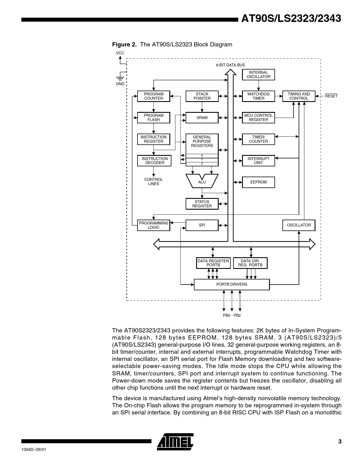 REG. PORTB PORTB DRIVERS PB0 -PB2 The AT90S2323/2343 provides the following features: 2K bytes of In-System Programmabl e Flash, 128 bytes EEPROM, 128 bytes SRAM, 3 (A T90S/LS2323)/5