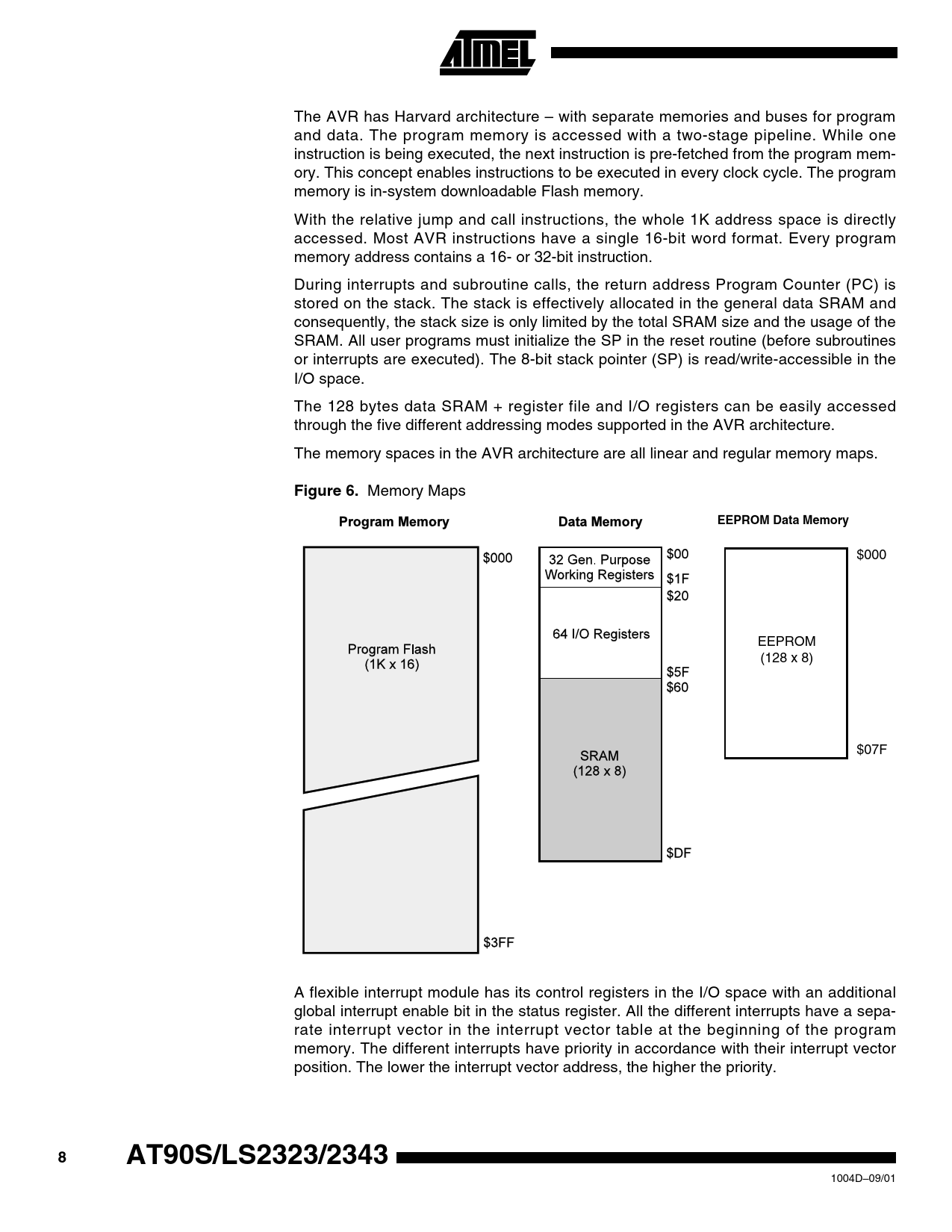The AVR has Harvard architecture – with separate memories and buses for program and data. The program memory is accessed with a two-stage pipeline. While one instruction is being executed, the next instruction is pre-fetched from the program memory. This concept enables instructions to be executed in every clock cycle. The program memory is in-system downloadable Flash memory. With the relative jump and call instructions, the whole 1K address space is directly accessed. Most AVR instructions have a single 16-bit word format. Every program memory address contains a 16-or 32-bit instruction. During interrupts and subroutine calls, the return address Program Counter (PC) is stored on the stack. The stack is effectively allocated in the general data SRAM and consequently, the stack size is only limited by the total SRAM size and the usage of the SRAM. All user programs must initialize the SP in the reset routine (before subroutines or interrupts are executed). The 8-bit stack pointer (SP) is read/write-accessible in the I/O space. The 128 bytes data SRAM + register file and I/O registers can be easily accessed through the five different addressing modes supported in the AVR architecture. The memory spaces in the AVR architecture are all linear and regular memory maps. Figure 6. Memory Maps EEPROM Data Memory $000 EEPROM (128 x 8) $07F A flexible interrupt module has its control registers in the I/O space with an additional global interrupt enable bit in the status register. All the different interrupts have a separate interrupt vector in the interrupt vector table at the beginning of the program memory. The different interrupts have priority in accordance with their interrupt vector position. The lower the interrupt vector address, the higher the priority. 8 AT90S/LS2323/2343 1004D–09/01