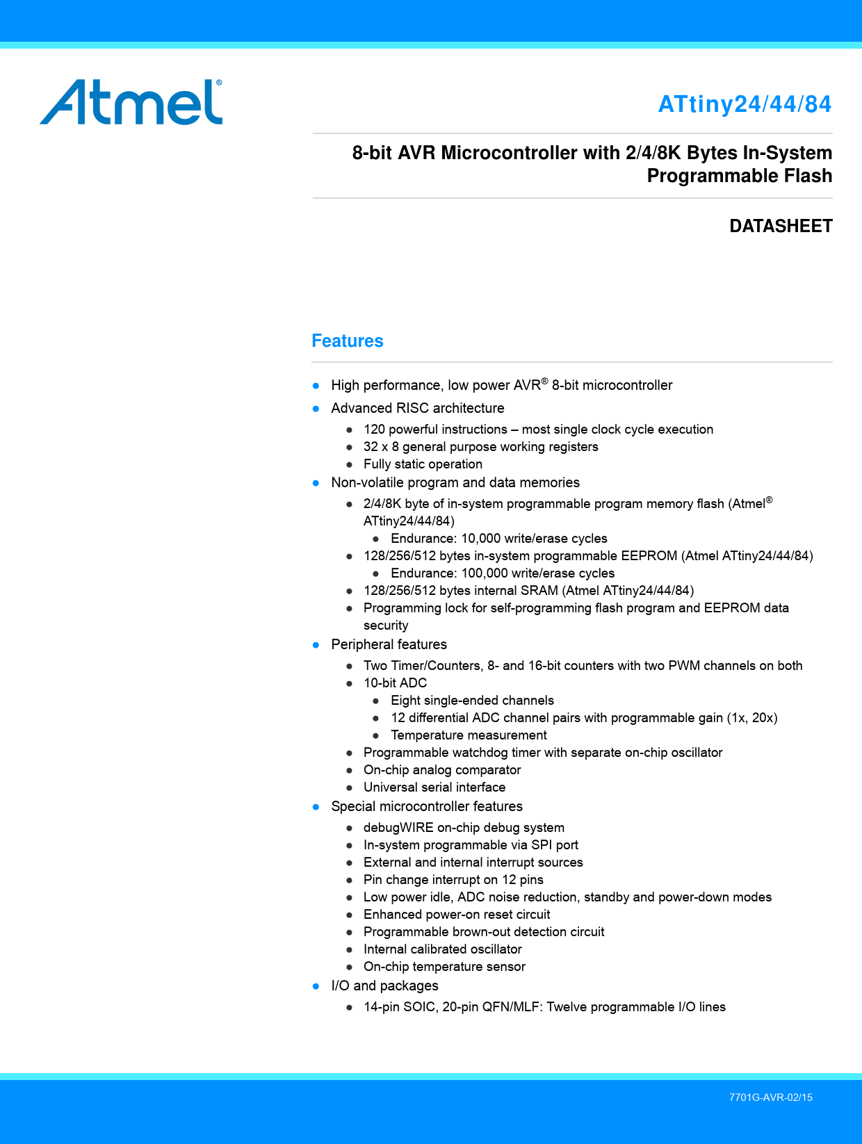 ATtiny24/44/84. 8-bit AVR Microcontroller with 2/4/8K Bytes In-System. Programmable Flash. DATASHEET. Features