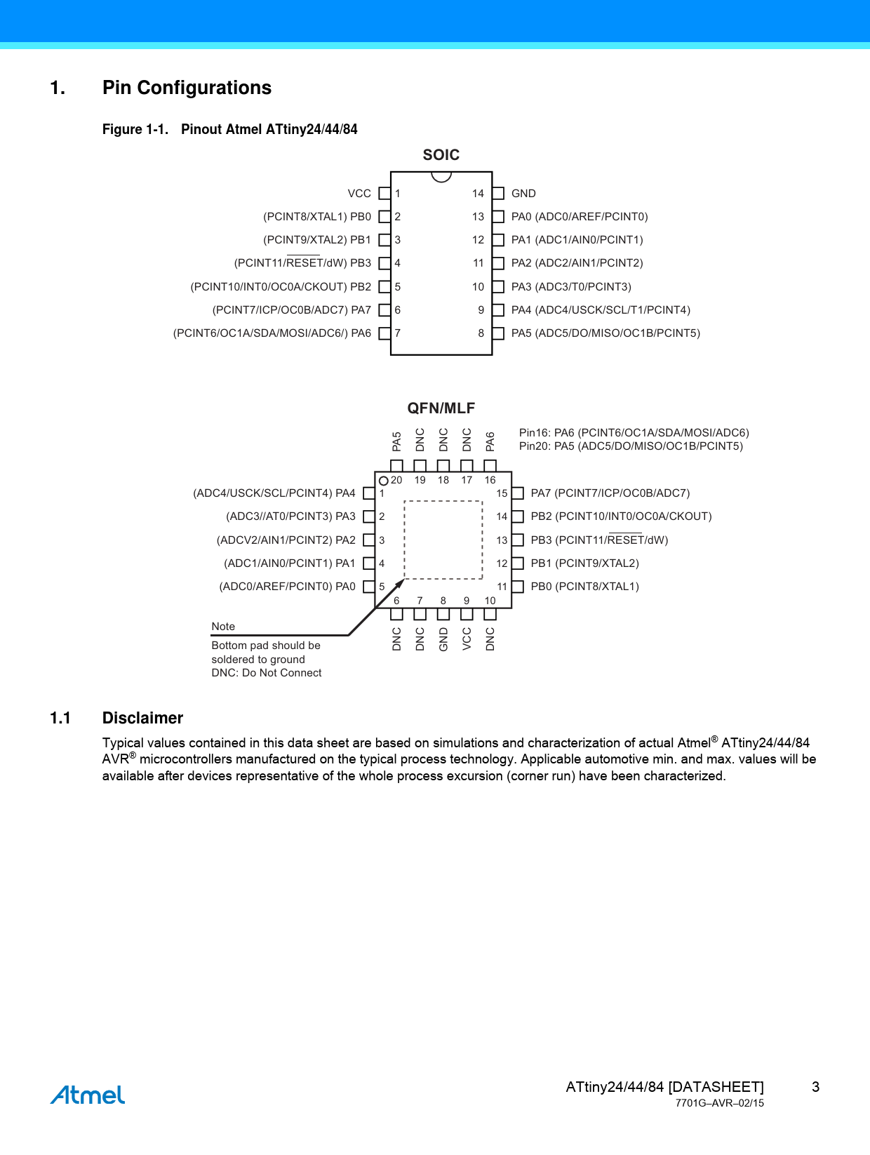 Pin Configurations. Figure 1-1. Pinout Atmel ATtiny24/44/84. SOIC. QFN/MLF. 1.1. Disclaimer