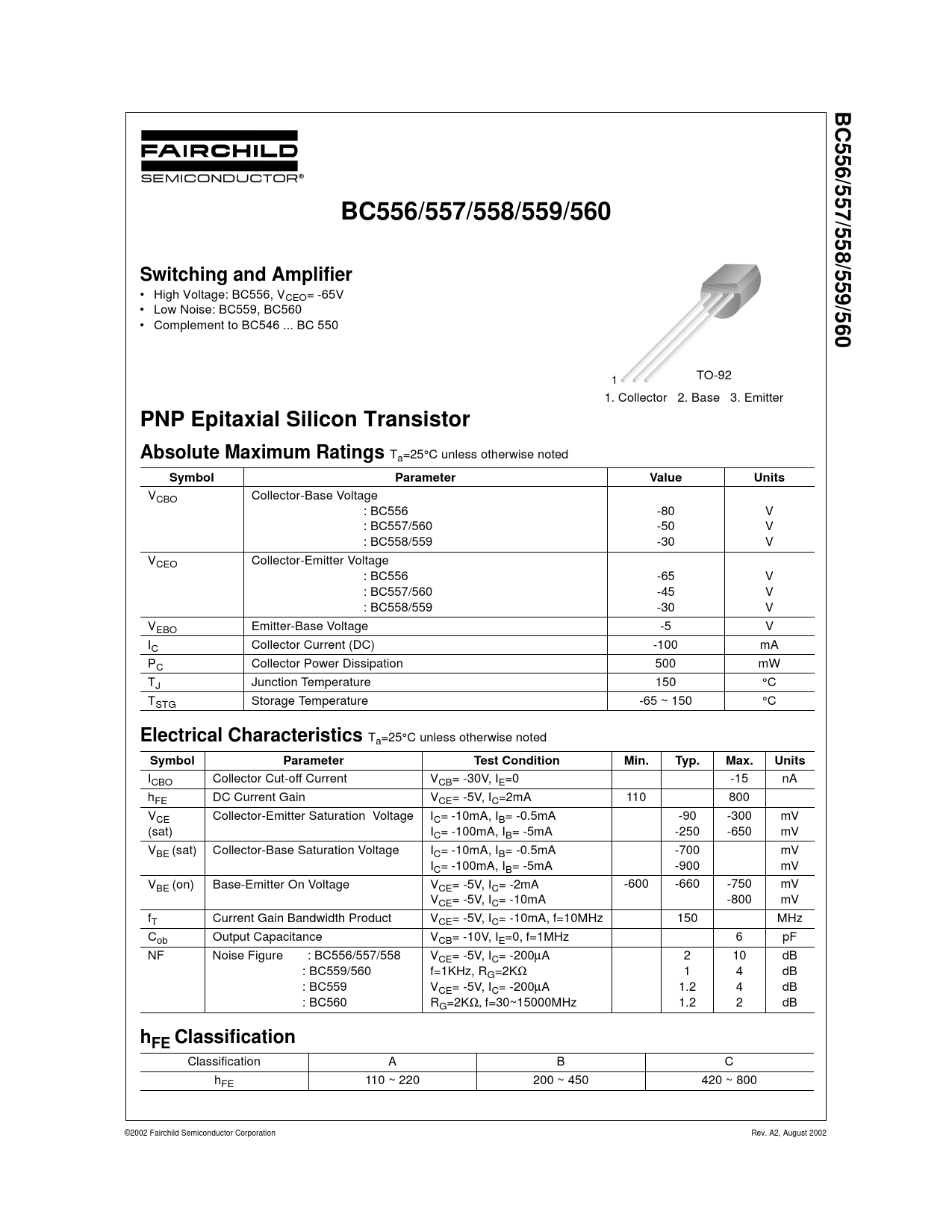 Classification A B C hFE 110 ~ 220 200 ~ 450 420 ~ 800 ©2002 Fairchild Semiconductor Corporation Rev. A2, August 2002