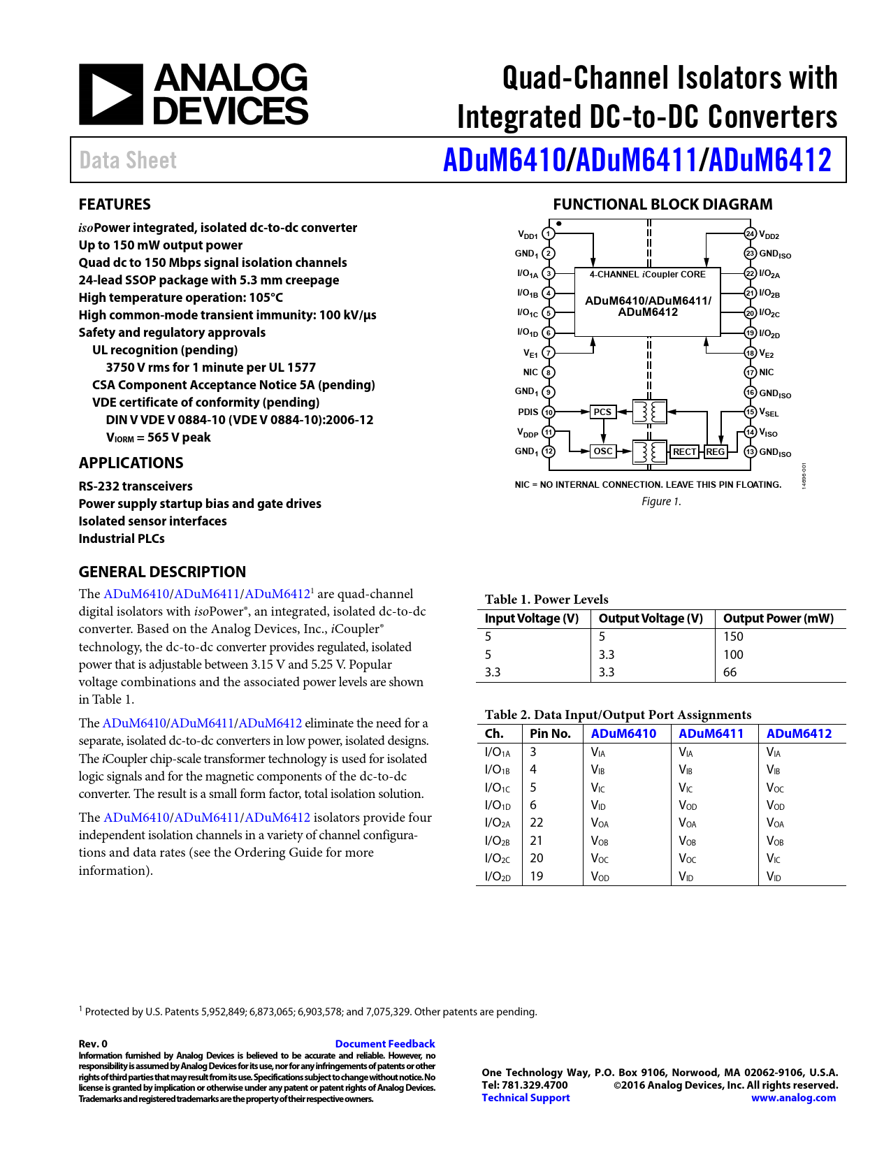Quad-Channel Isolators with. Integrated DC-to-DC Converters. Data Sheet. ADuM6410/. ADuM6411/. ADuM6412. FEATURES