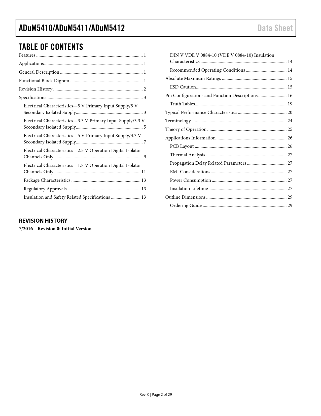 link to page 1 link to page 1 link to page 1 link to page 1 link to page 2 link to page 3 link to page 3 link to page 3 link to page 5 link to page 5 link to page 7 link to page 7 link to page 9 link to page 9 link to page 11 link to page 11 link to page 13 link to page 13 link to page 13 link to page 14 link to page 14 link to page 14 link to page 15 link to page 15 link to page 16 link to page 19 link to page 20 link to page 24 link to page 25 link to page 26 link to page 26 link to page 27 link to page 27 link to page 27 link to page 27 link to page 27 link to page 29 link to page 29 ADuM5410/ADuM5411/ADuM5412Data SheetTABLE OF CONTENTS Features .. 1 DIN V VDE V 0884-10 (VDE V 0884-10) Insulation Applications ... 1 Characteristics .. 14 General Description ... 1 Recommended Operating Conditions .. 14 Functional Block Digram .. 1 Absolute Maximum Ratings ... 15 Revision History ... 2 ESD Caution.. 15 Specifications ... 3 Pin Configurations and Function Descriptions ... 16 Electrical Characteristics—5 V Primary Input Supply/5 V Truth Tables... 19 Secondary Isolated Supply... 3 Typical Performance Characteristics ... 20 Electrical Characteristics—3.3 V Primary Input Supply/3.3 V Terminology .. 24 Secondary Isolated Supply... 5 Theory of Operation .. 25 Electrical Characteristics—5 V Primary Input Supply/3.3 V Applications Information .. 26 Secondary Isolated Supply... 7 PCB Layout ... 26 Electrical Characteristics—2.5 V Operation Digital Isolator Channels Only .. 9 Thermal Analysis ... 27 Electrical Characteristics—1.8 V Operation Digital Isolator Propagation Delay Related Parameters ... 27 Channels Only .. 11 EMI Considerations ... 27 Package Characteristics ... 13 Power Consumption .. 27 Regulatory Approvals ... 13 Insulation Lifetime ... 27 Insulation and Safety Related Specifications .. 13 Outline Dimensions ... 29 Ordering Guide .. 29 REVISION HISTORY 7/2016—Revision 0: Initial Version Rev. 0 | Page 2 of 29 Document Outline FEATURES APPLICATIONS GENERAL DESCRIPTION FUNCTIONAL BLOCK DIGRAM REVISION HISTORY SPECIFICATIONS ELECTRICAL CHARACTERISTICS—5 V PRIMARY INPUT SUPPLY/5 V SECONDARY ISOLATED SUPPLY ELECTRICAL CHARACTERISTICS—3.3 V PRIMARY INPUT SUPPLY/3.3 V SECONDARY ISOLATED SUPPLY ELECTRICAL CHARACTERISTICS—5 V PRIMARY INPUT SUPPLY/3.3 V SECONDARY ISOLATED SUPPLY ELECTRICAL CHARACTERISTICS—2.5 V OPERATION DIGITAL ISOLATOR CHANNELS ONLY ELECTRICAL CHARACTERISTICS—1.8 V OPERATION DIGITAL ISOLATOR CHANNELS ONLY PACKAGE CHARACTERISTICS REGULATORY APPROVALS INSULATION AND SAFETY RELATED SPECIFICATIONS DIN V VDE V 0884-10 (VDE V 0884-10) INSULATION CHARACTERISTICS RECOMMENDED OPERATING CONDITIONS ABSOLUTE MAXIMUM RATINGS ESD CAUTION PIN CONFIGURATIONS AND FUNCTION DESCRIPTIONS TRUTH TABLES TYPICAL PERFORMANCE CHARACTERISTICS TERMINOLOGY THEORY OF OPERATION APPLICATIONS INFORMATION PCB LAYOUT THERMAL ANALYSIS PROPAGATION DELAY RELATED PARAMETERS EMI CONSIDERATIONS POWER CONSUMPTION INSULATION LIFETIME Surface Tracking Insulation Wear Out Calculation and Use of Parameters Example OUTLINE DIMENSIONS ORDERING GUIDE