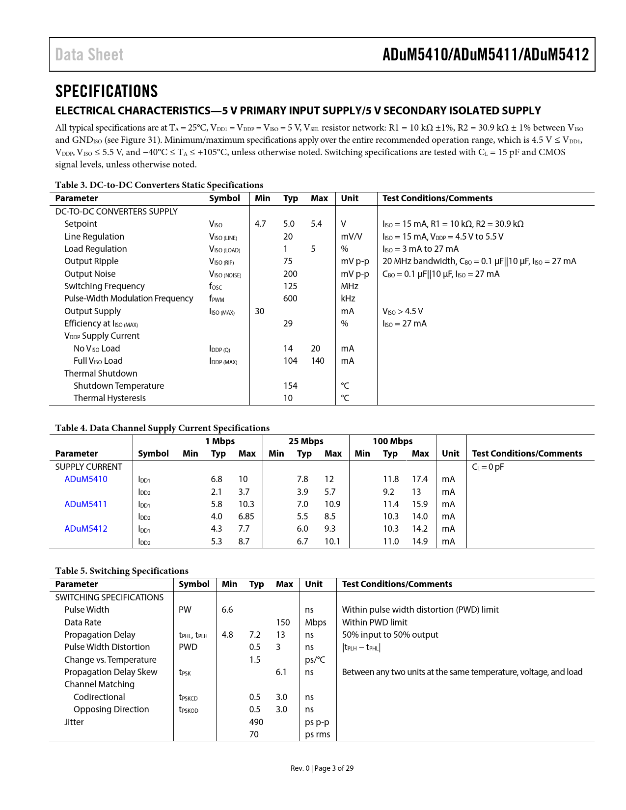 link to page 26 Data SheetADuM5410/ADuM5411/ADuM5412SPECIFICATIONS ELECTRICAL CHARACTERISTICS—5 V PRIMARY INPUT SUPPLY/5 V SECONDARY ISOLATED SUPPLY All typical specifications are at TA = 25°C, VDD1 = VDDP = VISO = 5 V, VSEL resistor network: R1 = 10 kΩ ±1%, R2 = 30.9 kΩ ± 1% between VISO and GNDISO (see Figure 31). Minimum/maximum specifications apply over the entire recommended operation range, which is 4.5 V ≤ VDD1, VDDP, VISO ≤ 5.5 V, and −40°C ≤ TA ≤ +105°C, unless otherwise noted. Switching specifications are tested with CL = 15 pF and CMOS signal levels, unless otherwise noted. Table 3. DC-to-DC Converters Static Specifications ParameterSymbolMinTypMaxUnitTest Conditions/Comments DC-TO-DC CONVERTERS SUPPLY Setpoint VISO 4.7 5.0 5.4 V IISO = 15 mA, R1 = 10 kΩ, R2 = 30.9 kΩ Line Regulation VISO (LINE) 20 mV/V IISO = 15 mA, VDDP = 4.5 V to 5.5 V Load Regulation VISO (LOAD) 1 5 % IISO = 3 mA to 27 mA Output Ripple VISO (RIP) 75 mV p-p 20 MHz bandwidth, CBO = 0.1 µF||10 µF, IISO = 27 mA Output Noise VISO (NOISE) 200 mV p-p CBO = 0.1 µF||10 µF, IISO = 27 mA Switching Frequency fOSC 125 MHz Pulse-Width Modulation Frequency fPWM 600 kHz Output Supply IISO (MAX) 30 mA VISO > 4.5 V Efficiency at IISO (MAX) 29 % IISO = 27 mA VDDP Supply Current No VISO Load IDDP (Q) 14 20 mA Full VISO Load IDDP (MAX) 104 140 mA Thermal Shutdown Shutdown Temperature 154 °C Thermal Hysteresis 10 °C Table 4. Data Channel Supply Current Specifications1 Mbps25 Mbps100 MbpsParameterSymbolMinTypMaxMinTypMaxMinTypMaxUnitTest Conditions/Comments SUPPLY CURRENT CL = 0 pF ADuM5410 IDD1 6.8 10 7.8 12 11.8 17.4 mA IDD2 2.1 3.7 3.9 5.7 9.2 13 mA ADuM5411 IDD1 5.8 10.3 7.0 10.9 11.4 15.9 mA IDD2 4.0 6.85 5.5 8.5 10.3 14.0 mA ADuM5412 IDD1 4.3 7.7 6.0 9.3 10.3 14.2 mA IDD2 5.3 8.7 6.7 10.1 11.0 14.9 mA Table 5. Switching Specifications ParameterSymbol Min Typ Max UnitTest Conditions/Comments SWITCHING SPECIFICATIONS Pulse Width PW 6.6 ns Within pulse width distortion (PWD) limit Data Rate 150 Mbps Within PWD limit Propagation Delay tPHL, tPLH 4.8 7.2 13 ns 50% input to 50% output Pulse Width Distortion PWD 0.5 3 ns |tPLH − tPHL| Change vs. Temperature 1.5 ps/°C Propagation Delay Skew tPSK 6.1 ns Between any two units at the same temperature, voltage, and load Channel Matching Codirectional tPSKCD 0.5 3.0 ns Opposing Direction tPSKOD 0.5 3.0 ns Jitter 490 ps p-p 70 ps rms Rev. 0 | Page 3 of 29 Document Outline FEATURES APPLICATIONS GENERAL DESCRIPTION FUNCTIONAL BLOCK DIGRAM REVISION HISTORY SPECIFICATIONS ELECTRICAL CHARACTERISTICS—5 V PRIMARY INPUT SUPPLY/5 V SECONDARY ISOLATED SUPPLY ELECTRICAL CHARACTERISTICS—3.3 V PRIMARY INPUT SUPPLY/3.3 V SECONDARY ISOLATED SUPPLY ELECTRICAL CHARACTERISTICS—5 V PRIMARY INPUT SUPPLY/3.3 V SECONDARY ISOLATED SUPPLY ELECTRICAL CHARACTERISTICS—2.5 V OPERATION DIGITAL ISOLATOR CHANNELS ONLY ELECTRICAL CHARACTERISTICS—1.8 V OPERATION DIGITAL ISOLATOR CHANNELS ONLY PACKAGE CHARACTERISTICS REGULATORY APPROVALS INSULATION AND SAFETY RELATED SPECIFICATIONS DIN V VDE V 0884-10 (VDE V 0884-10) INSULATION CHARACTERISTICS RECOMMENDED OPERATING CONDITIONS ABSOLUTE MAXIMUM RATINGS ESD CAUTION PIN CONFIGURATIONS AND FUNCTION DESCRIPTIONS TRUTH TABLES TYPICAL PERFORMANCE CHARACTERISTICS TERMINOLOGY THEORY OF OPERATION APPLICATIONS INFORMATION PCB LAYOUT THERMAL ANALYSIS PROPAGATION DELAY RELATED PARAMETERS EMI CONSIDERATIONS POWER CONSUMPTION INSULATION LIFETIME Surface Tracking Insulation Wear Out Calculation and Use of Parameters Example OUTLINE DIMENSIONS ORDERING GUIDE