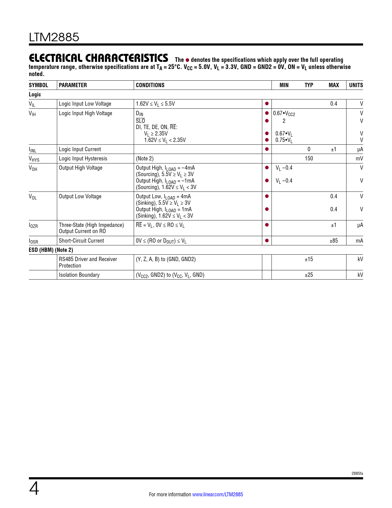 LTM2885 ELECTRICALCHARACTERISTICS The l denotes the specifications which apply over the full operatingtemperature range, otherwise specifications are at TA = 25°C. VCC = 5.0V, VL = 3.3V, GND = GND2 = 0V, ON = VL unless otherwisenoted. SYMBOLPARAMETERCONDITIONSMINTYPMAXUNITSLogic VIL Logic Input Low Voltage 1.62V ≤ VL ≤ 5.5V l 0.4 V VIH Logic Input High Voltage DIN l 0.67•VCC2 V SLO l 2 V DI, TE, DE, ON, RE: VL ≥ 2.35V l 0.67•VL V 1.62V ≤ VL < 2.35V l 0.75•VL V IINL Logic Input Current l 0 ±1 µA VHYS Logic Input Hysteresis (Note 2) 150 mV VOH Output High Voltage Output High, ILOAD = –4mA l VL –0.4 V (Sourcing), 5.5V ≥ VL ≥ 3V Output High, ILOAD = –1mA l VL –0.4 V (Sourcing), 1.62V ≤ VL < 3V VOL Output Low Voltage Output Low, ILOAD = 4mA l 0.4 V (Sinking), 5.5V ≥ VL ≥ 3V Output High, ILOAD = 1mA l 0.4 V (Sinking), 1.62V ≤ VL < 3V IOZR Three-State (High Impedance) RE = VL, 0V ≤ RO ≤ VL l ±1 µA Output Current on RO IOSR Short-Circuit Current 0V ≤ (RO or DOUT) ≤ VL l ±85 mA ESD (HBM) (Note 2) RS485 Driver and Receiver (Y, Z, A, B) to (GND, GND2) ±15 kV Protection Isolation Boundary (VCC2, GND2) to (VCC, VL, GND) ±25 kV 2885fa 4 For more information www.linear.com/LTM2885 Document Outline Features Applications Description Typical Application Absolute Maximum Ratings Pin Configuration Order Information Electrical Characteristics Switching Characteristics Isolation Characteristics Typical Performance Characteristics Pin Functions Block Diagram Test Circuits Functional Table Applications Information Typical Application Related Parts