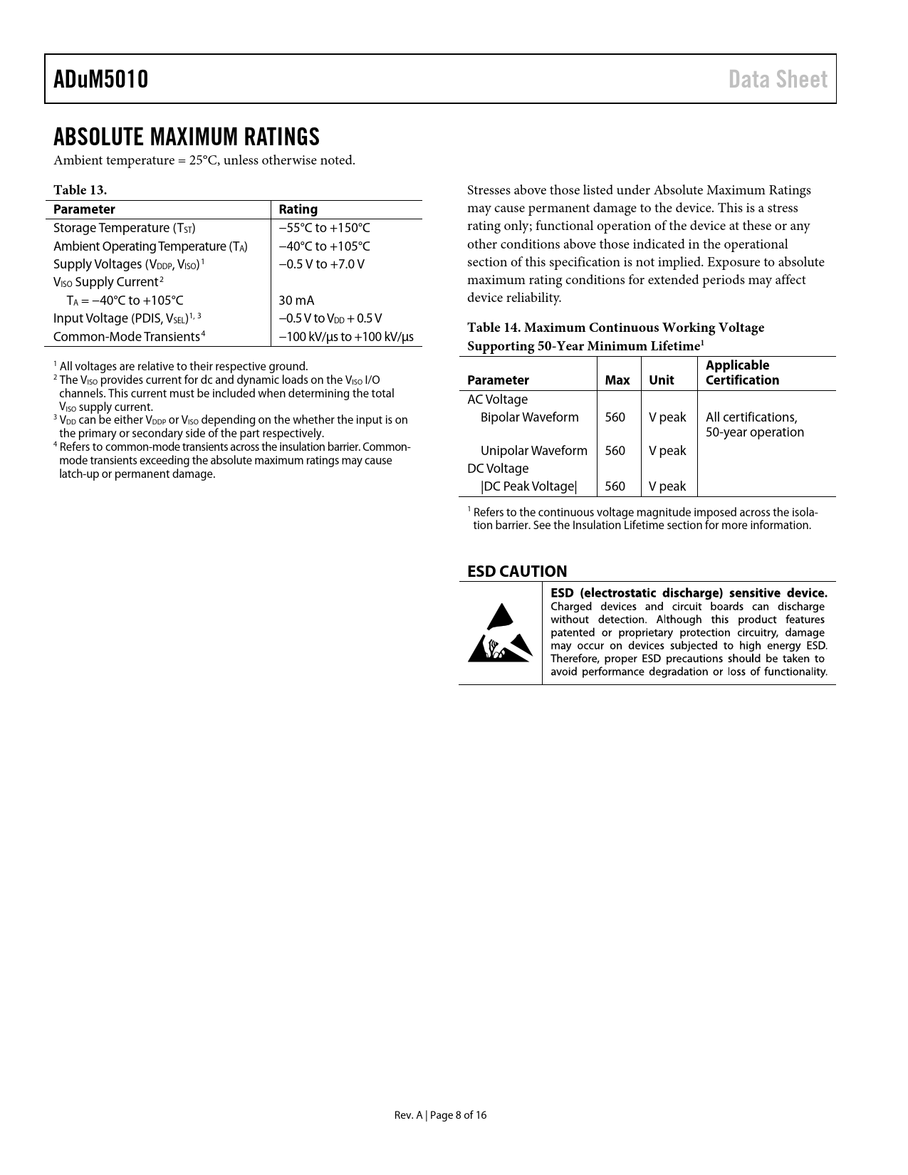 Pages / Page16 / 8 — ADuM5010. Data Sheet. ABSOLUTE MAXIMUM RATINGS. Table 13. Parameter. …