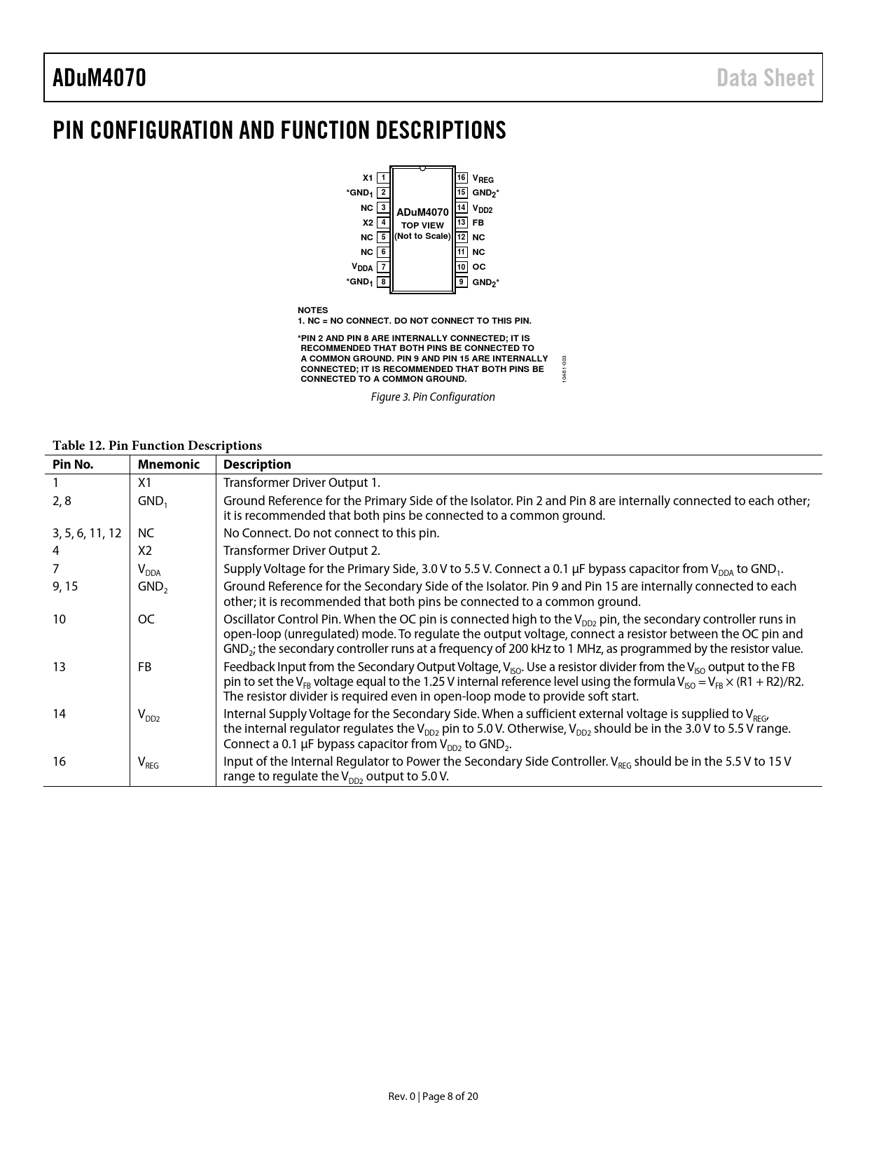 Pages / Page20 / 8 — ADuM4070. Data Sheet. PIN CONFIGURATION AND FUNCTION DESCRIPTIONS. VREG. …