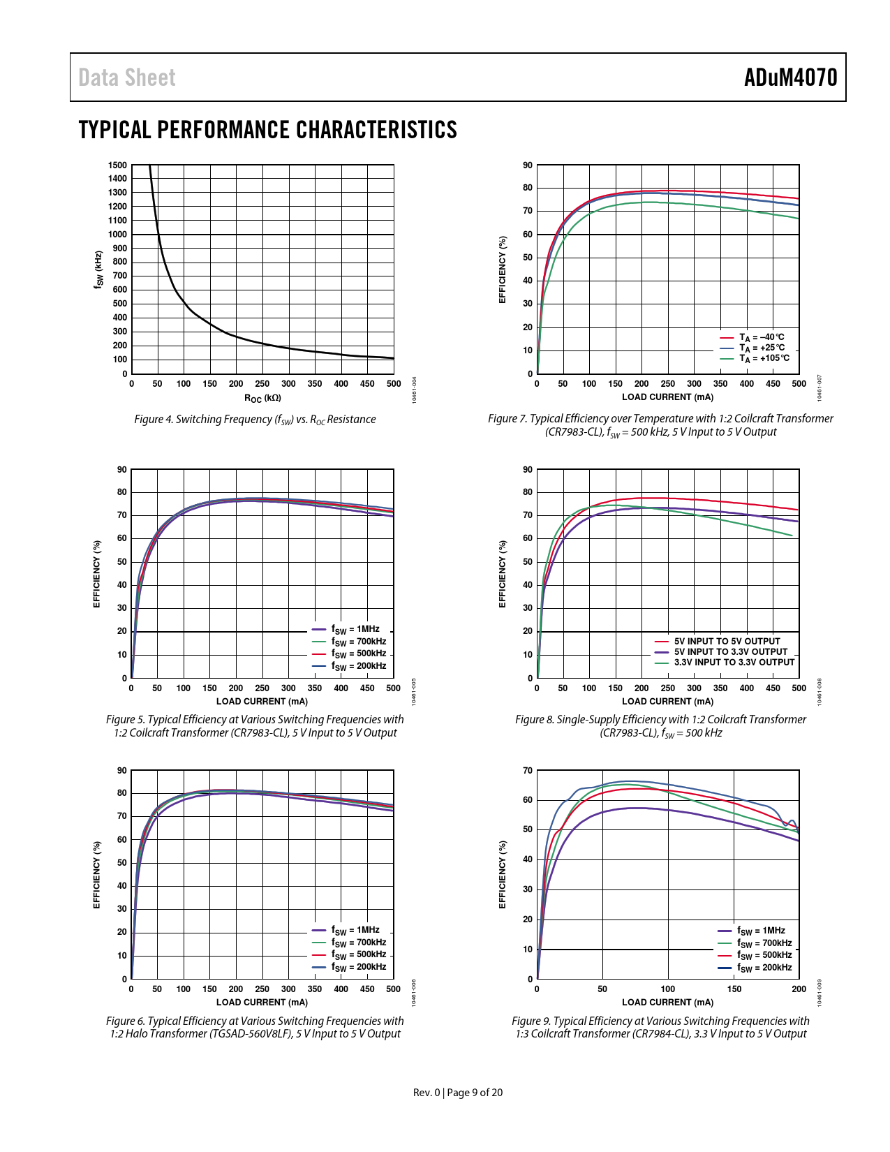 Data SheetADuM4070TYPICAL PERFORMANCE CHARACTERISTICS15009014008013001200701100100060%)900)(50800kHzNCY(700E40f SWICI600F F500E3040020300TA = –40°C20010TA = +25°C100TA = +105°C00050100150200250300350400450500 004 050100150200250300350400450500 007 ROC (kΩ)LOAD CURRENT (mA) 10461- 10461- Figure 4. Switching Frequency (fSW) vs. ROC Resistance Figure 7. Typical Efficiency over Temperature with 1:2 Coilcraft Transformer (CR7983-CL), fSW = 500 kHz, 5 V Input to 5 V Output 9090808070706060%)%)((5050NCYNCYEE40ICI40ICIFFFFE30E3020fSW = 1MHz20fSW = 700kHz5V INPUT TO 5V OUTPUT10f5V INPUT TO 3.3V OUTPUTSW = 500kHz10f3.3V INPUT TO 3.3V OUTPUTSW = 200kHz00050100150200250300350400450500 005 050100150200250300350400450500 008 LOAD CURRENT (mA) 10461- LOAD CURRENT (mA) 10461- Figure 5. Typical Efficiency at Various Switching Frequencies with Figure 8. Single-Supply Efficiency with 1:2 Coilcraft Transformer 1:2 Coilcraft Transformer (CR7983-CL), 5 V Input to 5 V Output (CR7983-CL), fSW = 500 kHz 90708060705060%)%)((5040NCYNCYEE40ICIICI30FFFFE30E2020fSW = 1MHzfSW = 1MHzfSW = 700kHzf10SW = 700kHz10fSW = 500kHzfSW = 500kHzfSW = 200kHzfSW = 200kHz00050100150200250300350400450500 006 009 050100150200LOAD CURRENT (mA) 10461- LOAD CURRENT (mA) 10461- Figure 6. Typical Efficiency at Various Switching Frequencies with Figure 9. Typical Efficiency at Various Switching Frequencies with 1:2 Halo Transformer (TGSAD-560V8LF), 5 V Input to 5 V Output 1:3 Coilcraft Transformer (CR7984-CL), 3.3 V Input to 5 V Output Rev. 0 | Page 9 of 20 Document Outline Features Applications Functional Block Diagram General Description Table of Contents Revision History Specifications Electrical Characteristics—5 V Primary Input Supply/5 V Secondary Isolated Supply Electrical Characteristics—3.3 V Primary Input Supply/3.3 V Secondary Isolated Supply Electrical Characteristics—5 V Primary Input Supply/3.3 V Secondary Isolated Supply Electrical Characteristics—5 V Primary Input Supply/15 V Secondary Isolated Supply Package Characteristics Regulatory Approvals (Pending) Insulation and Safety-Related Specifications DIN V VDE V 0884-10 (VDE V 0884-10):2006-12 Insulation Characteristics Recommended Operating Conditions Absolute Maximum Ratings ESD Caution Pin Configuration and Function Descriptions Typical Performance Characteristics Applications Information Application Schematics Transformer Design Transformer Turns Ratio Transformer ET Constant Transformer Primary Inductance and Resistance Transformer Isolation Voltage Switching Frequency Transient Response Component Selection Printed Circuit Board (PCB) Layout Thermal Analysis Power Consumption Power Considerations Soft Start Mode and Current-Limit Protection Insulation Lifetime Outline Dimensions Ordering Guide