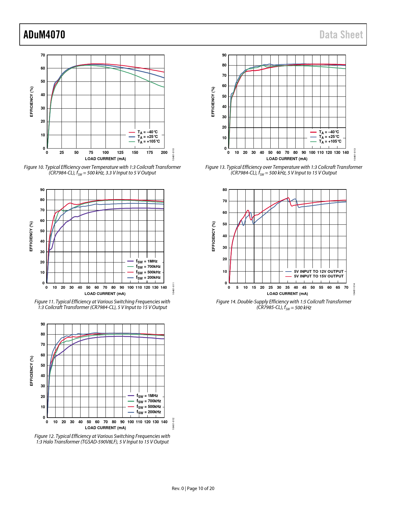 10461- Figure 10. Typical Efficiency over Temperature with 1:3 Coilcraft Transformer Figure 13. Typical Efficiency over Temperature with 1:3 Coilcraft Transformer (CR7984-CL), fSW = 500 kHz, 3.3 V Input to 5 V Output (CR7984-CL), fSW = 500 kHz, 5 V Input to 15 V Output