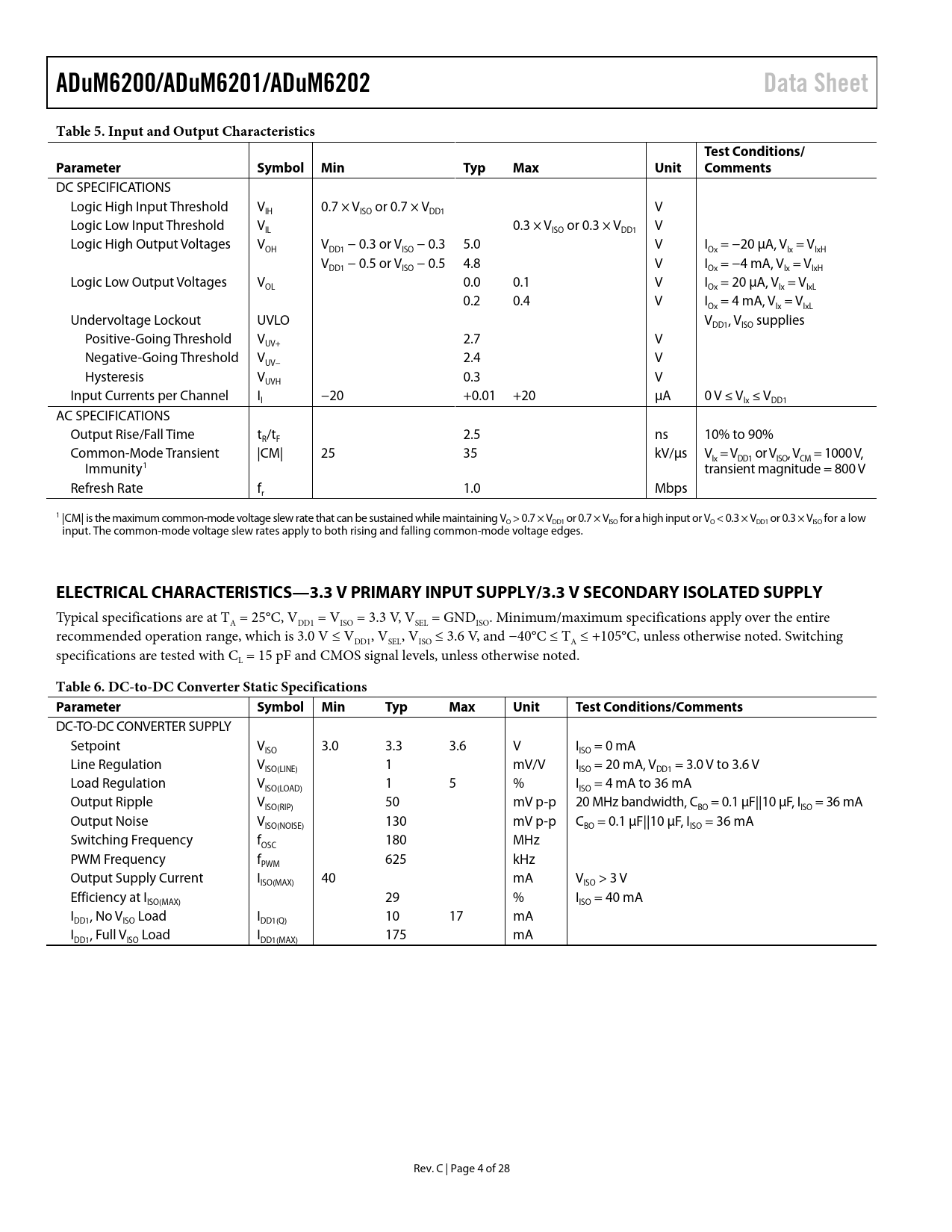 ADuM6200/ADuM6201/ADuM6202. Data Sheet. Table 5. Input and Output Characteristics. Test Conditions/. Parameter. Symbol Min. Typ. Max
