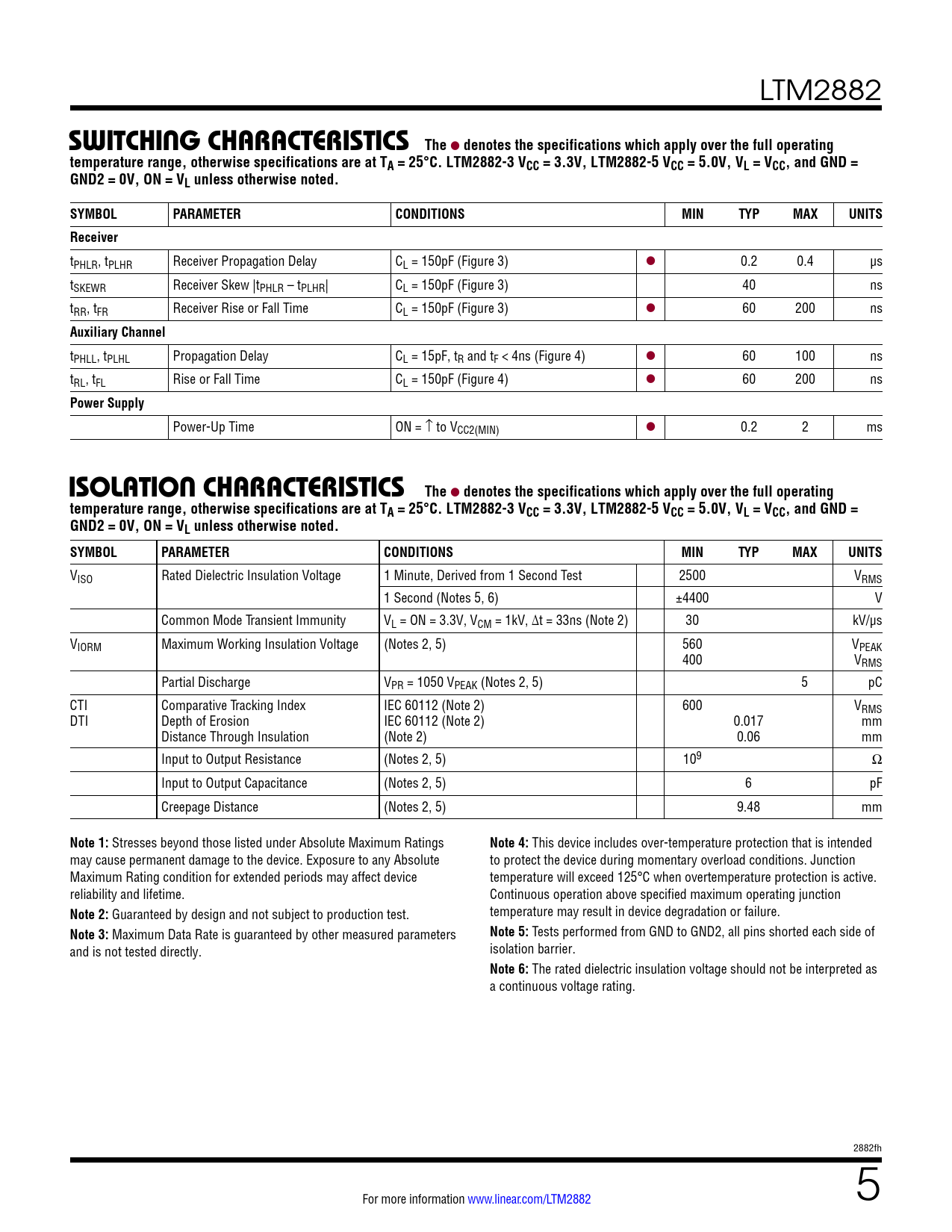 denotes the specifications which apply over the full operating temperature range, otherwise specifications are at TA = 25°C. LTM2882-3 VCC = 3.3V, LTM2882-5 VCC = 5.0V, VL = VCC, and GND = GND2 = 0V, ON = VL unless otherwise noted. SYMBOL PARAMETER CONDITIONS MIN TYP MAX UNITS Receiver