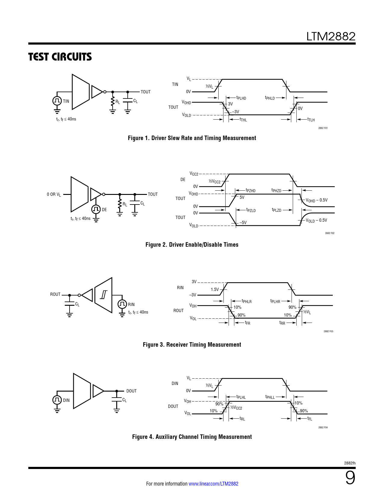 LTM2882 TEST CIRCUITS VL TIN ½VL TOUT 0V t TIN PLHD tPHLD RL CL VOHD 3V TOUT 0V –3V VOLD tr, tf ≤ 40ns tTHL tTLH 2882 F01 Figure 1. Driver Slew Rate and Timing Measurement VCC2 DE ½VCC2 0V tPZHD tPHZD 0 OR V V L TOUT OHD TOUT 5V V R OHD – 0.5V L CL 0V DE tPZLD tPLZD 0V tr, tf ≤ 40ns TOUT VOLD – 0.5V V –5V OLD 2882 F02 Figure 2. Driver Enable/Disable Times 3V RIN 1.5V ROUT –3V t C PHLR tPLHR L RIN VOH 10% 90% ROUT t ½V r, tf ≤ 40ns L 90% 10% VOL tFR tRR 2882 F03 Figure 3. Receiver Timing Measurement VL DIN ½VL DOUT 0V t DIN C PLHL tPHLL L VOH 90% 10% DOUT ½V 10% CC2 90% VOL tRL tFL 2882 F04 Figure 4. Auxiliary Channel Timing Measurement 2882fh For more information www.linear.com/LTM2882 9 Document Outline FEATURES DESCRIPTION APPLICATIONS TYPICAL APPLICATION ABSOLUTE MAXIMUM RATINGS PIN CONFIGURATION ORDER INFORMATION ELECTRICAL CHARACTERISTICS SWITCHING CHARACTERISTICS ISOLATION CHARACTERISTICS TYPICAL PERFORMANCE CHARACTERISTICS TEST CIRCUITS PIN FUNCTIONS BLOCK DIAGRAM APPLICATIONS INFORMATION TYPICAL APPLICATIONS PACKAGE DESCRIPTION REVISION HISTORY TYPICAL APPLICATIONS RELATED PARTS