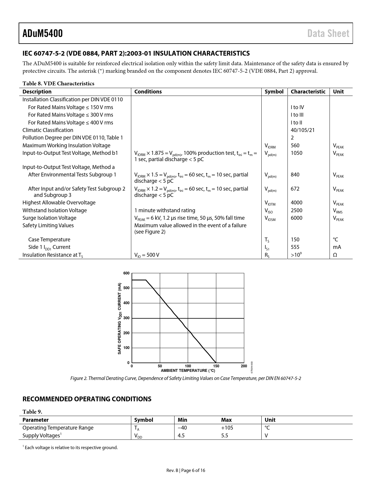 link to page 6 link to page 6 ADuM5400Data SheetIEC 60747-5-2 (VDE 0884, PART 2):2003-01 INSULATION CHARACTERISTICS The ADuM5400 is suitable for reinforced electrical isolation only within the safety limit data. Maintenance of the safety data is ensured by protective circuits. The asterisk (*) marking branded on the component denotes IEC 60747-5-2 (VDE 0884, Part 2) approval. Table 8. VDE Characteristics DescriptionConditionsSymbol Characteristic Unit Installation Classification per DIN VDE 0110 For Rated Mains Voltage ≤ 150 V rms I to IV For Rated Mains Voltage ≤ 300 V rms I to III For Rated Mains Voltage ≤ 400 V rms I to II Climatic Classification 40/105/21 Pollution Degree per DIN VDE 0110, Table 1 2 Maximum Working Insulation Voltage V 560 V IORM PEAK Input-to-Output Test Voltage, Method b1 V × 1.875 = V , 100% production test, t = t = V 1050 V IORM pd(m) ini m pd(m) PEAK 1 sec, partial discharge < 5 pC Input-to-Output Test Voltage, Method a After Environmental Tests Subgroup 1 V × 1.5 = V , t = 60 sec, t = 10 sec, partial V 840 V IORM pd(m) ini m pd(m) PEAK discharge < 5 pC After Input and/or Safety Test Subgroup 2 V × 1.2 = V , t = 60 sec, t = 10 sec, partial V 672 V IORM pd(m) ini m pd(m) PEAK and Subgroup 3 discharge < 5 pC Highest Allowable Overvoltage V 4000 V IOTM PEAK Withstand Isolation Voltage 1 minute withstand rating V 2500 V ISO RMS Surge Isolation Voltage V = 6 kV, 1.2 µs rise time, 50 µs, 50% fall time V 6000 V PEAK IOSM PEAK Safety Limiting Values Maximum value allowed in the event of a failure (see Figure 2) Case Temperature T 150 °C S Side 1 I Current I 555 mA DD1 S1 Insulation Resistance at T V = 500 V R >109 Ω S IO S 600mA) 500( NT400CURREDD1 300G VTIN A 200R EOP FE 100A S0 050100150200 003 AMBIENT TEMPERATURE (°C) 07509- Figure 2. Thermal Derating Curve, Dependence of Safety Limiting Values on Case Temperature, per DIN EN 60747-5-2 RECOMMENDED OPERATING CONDITIONSTable 9. ParameterSymbolMinMaxUnit Operating Temperature Range T −40 +105 °C A Supply Voltages1 V 4.5 5.5 V DD 1 Each voltage is relative to its respective ground. Rev. B | Page 6 of 16 Document Outline Features Applications General Description Functional Block Diagram Table of Contents Revision History Specifications Electrical Characteristics Package Characteristics Regulatory Information Insulation and Safety Related Specifications IEC 60747-5-2 (VDE 0884, Part 2):2003-01 Insulation Characteristics Recommended Operating Conditions Absolute Maximum Ratings ESD Caution Pin Configuration and Function Descriptions Typical Performance Characteristics Terminology Applications Information PCB Layout EMI Considerations Propagation Delay Parameters DC Correctness and Magnetic Field Immunity Power Consumption Power Considerations Thermal Analysis Insulation Lifetime Outline Dimensions Ordering Guide