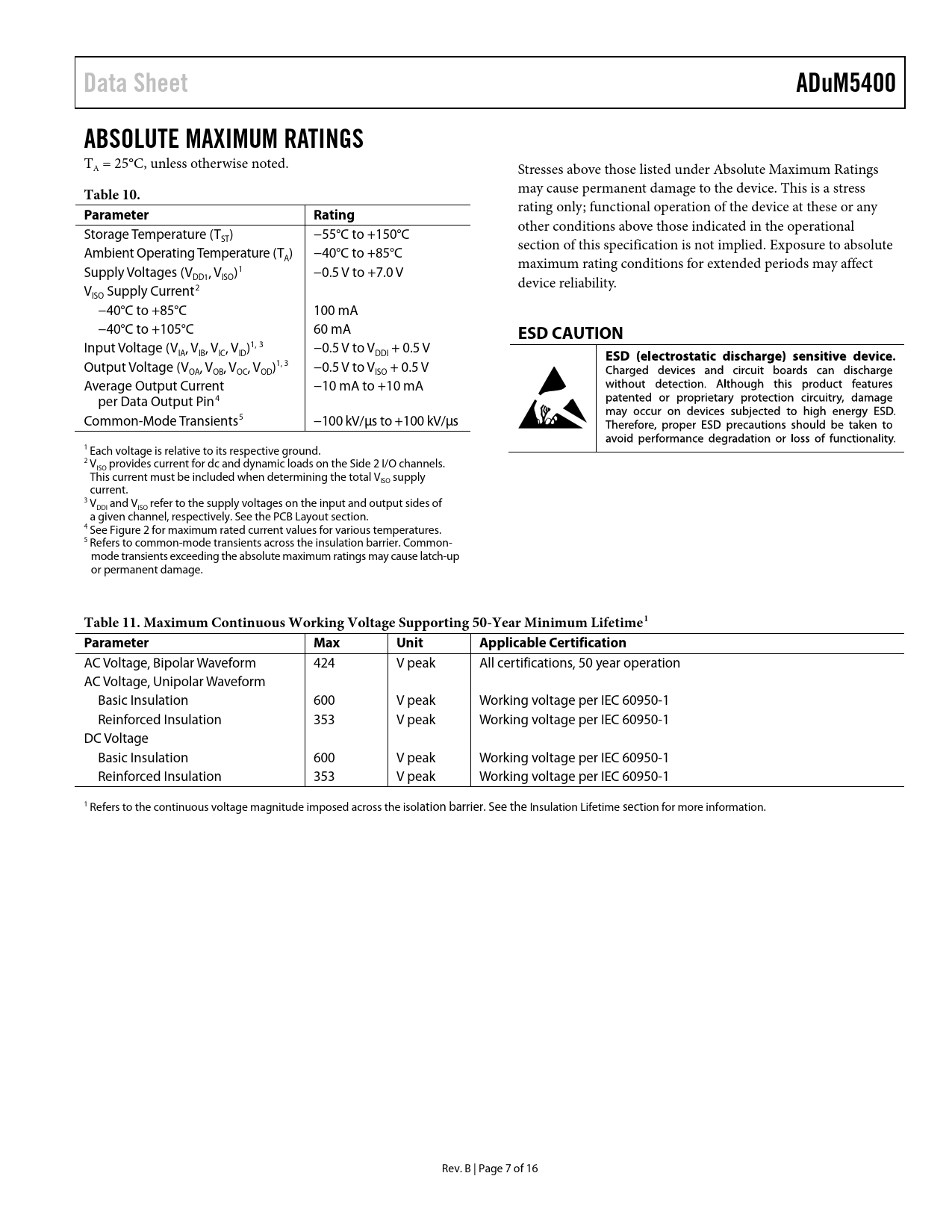 Data Sheet. ADuM5400. ABSOLUTE MAXIMUM RATINGS. Table 10. Parameter. Rating. ESD CAUTION