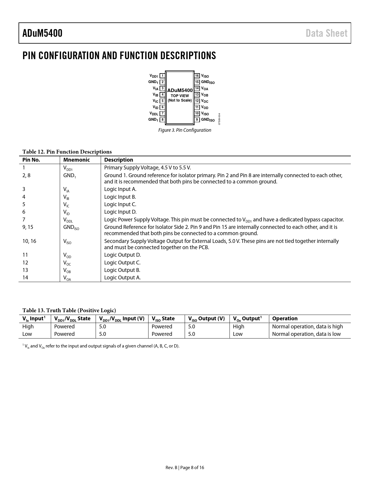 link to page 8 link to page 8 ADuM5400Data SheetPIN CONFIGURATION AND FUNCTION DESCRIPTIONSVDD1 116 VISOGND1 215 GNDISOVIA 314 VOAADuM5400VIB 413 VOBTOP VIEWV(Not to Scale)IC512 VOCVID 611 VODVDDL 710 VISO 004 GND1 89GNDISO 07509- Figure 3. Pin Configuration Table 12. Pin Function Descriptions Pin No.MnemonicDescription 1 V Primary Supply Voltage, 4.5 V to 5.5 V. DD1 2, 8 GND Ground 1. Ground reference for isolator primary. Pin 2 and Pin 8 are internally connected to each other, 1 and it is recommended that both pins be connected to a common ground. 3 V Logic Input A. IA 4 V Logic Input B. IB 5 V Logic Input C. IC 6 V Logic Input D. ID 7 V Logic Power Supply Voltage. This pin must be connected to V and have a dedicated bypass capacitor. DDL DD1 9, 15 GND Ground Reference for Isolator Side 2. Pin 9 and Pin 15 are internally connected to each other, and it is ISO recommended that both pins be connected to a common ground. 10, 16 V Secondary Supply Voltage Output for External Loads, 5.0 V. These pins are not tied together internally ISO and must be connected together on the PCB. 11 V Logic Output D. OD 12 V Logic Output C. OC 13 V Logic Output B. OB 14 V Logic Output A. OA Table 13. Truth Table (Positive Logic) V Input1V/VStateV/VInput (V) V StateV Output (V)V Output1OperationIxDD1DDLDD1DDLISOISOOx High Powered 5.0 Powered 5.0 High Normal operation, data is high Low Powered 5.0 Powered 5.0 Low Normal operation, data is low 1 VIx and VOx refer to the input and output signals of a given channel (A, B, C, or D). Rev. B | Page 8 of 16 Document Outline Features Applications General Description Functional Block Diagram Table of Contents Revision History Specifications Electrical Characteristics Package Characteristics Regulatory Information Insulation and Safety Related Specifications IEC 60747-5-2 (VDE 0884, Part 2):2003-01 Insulation Characteristics Recommended Operating Conditions Absolute Maximum Ratings ESD Caution Pin Configuration and Function Descriptions Typical Performance Characteristics Terminology Applications Information PCB Layout EMI Considerations Propagation Delay Parameters DC Correctness and Magnetic Field Immunity Power Consumption Power Considerations Thermal Analysis Insulation Lifetime Outline Dimensions Ordering Guide
