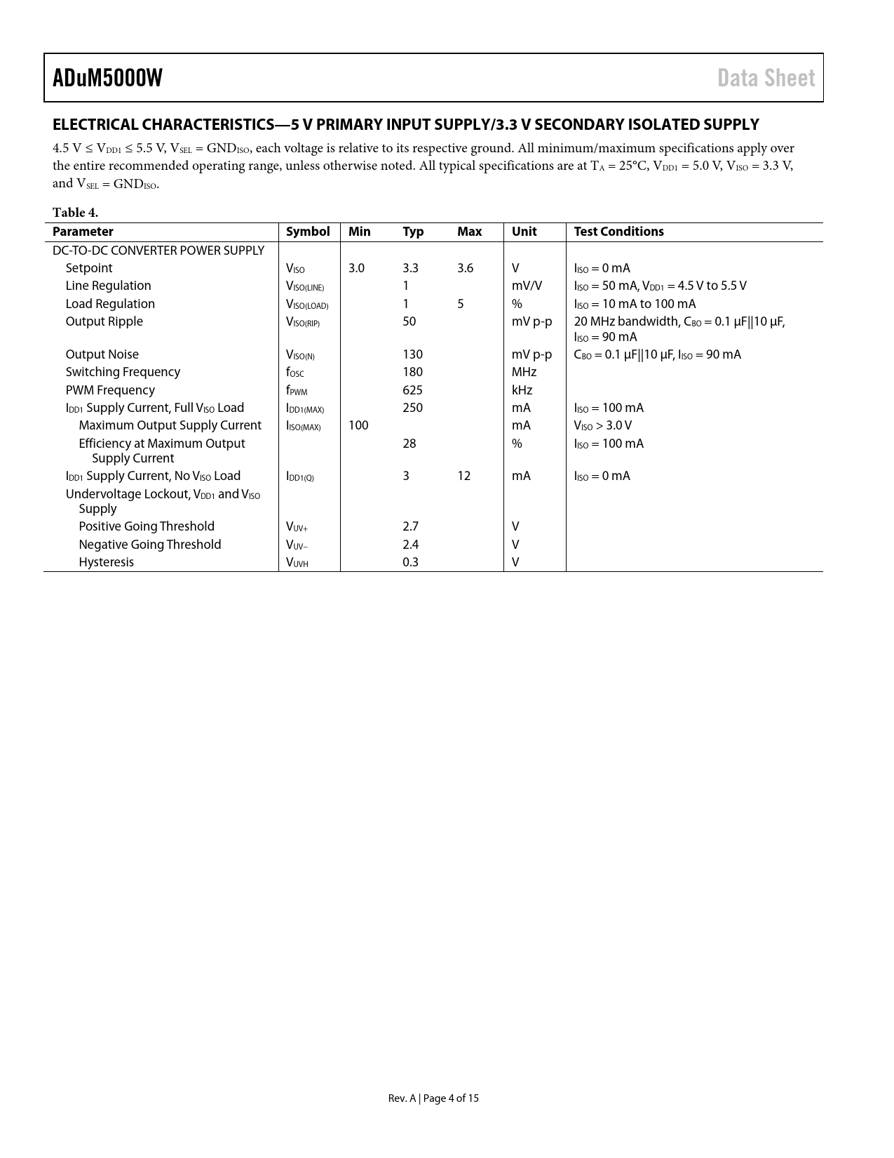 ADuM5000WData SheetELECTRICAL CHARACTERISTICS—5 V PRIMARY INPUT SUPPLY/3.3 V SECONDARY ISOLATED SUPPLY 4.5 V ≤ VDD1 ≤ 5.5 V, VSEL = GNDISO, each voltage is relative to its respective ground. All minimum/maximum specifications apply over the entire recommended operating range, unless otherwise noted. All typical specifications are at TA = 25°C, VDD1 = 5.0 V, VISO = 3.3 V, and VSEL = GNDISO. Table 4. ParameterSymbolMinTypMaxUnitTest Conditions DC-TO-DC CONVERTER POWER SUPPLY Setpoint VISO 3.0 3.3 3.6 V IISO = 0 mA Line Regulation VISO(LINE) 1 mV/V IISO = 50 mA, VDD1 = 4.5 V to 5.5 V Load Regulation VISO(LOAD) 1 5 % IISO = 10 mA to 100 mA Output Ripple VISO(RIP) 50 mV p-p 20 MHz bandwidth, CBO = 0.1 μF||10 μF, IISO = 90 mA Output Noise VISO(N) 130 mV p-p CBO = 0.1 μF||10 μF, IISO = 90 mA Switching Frequency fOSC 180 MHz PWM Frequency fPWM 625 kHz IDD1 Supply Current, Full VISO Load IDD1(MAX) 250 mA IISO = 100 mA Maximum Output Supply Current IISO(MAX) 100 mA VISO > 3.0 V Efficiency at Maximum Output 28 % IISO = 100 mA Supply Current IDD1 Supply Current, No VISO Load IDD1(Q) 3 12 mA IISO = 0 mA Undervoltage Lockout, VDD1 and VISO Supply Positive Going Threshold VUV+ 2.7 V Negative Going Threshold VUV− 2.4 V Hysteresis VUVH 0.3 V Rev. A | Page 4 of 15 Document Outline FEATURES APPLICATIONS FUNCTIONAL BLOCK DIAGRAM GENERAL DESCRIPTION REVISION HISTORY SPECIFICATIONS ELECTRICAL CHARACTERISTICS—5 V PRIMARY INPUT SUPPLY/5 V SECONDARY ISOLATED SUPPLY ELECTRICAL CHARACTERISTICS—3.3 V PRIMARY INPUT SUPPLY/3.3 V SECONDARY ISOLATED SUPPLY ELECTRICAL CHARACTERISTICS—5 V PRIMARY INPUT SUPPLY/3.3 V SECONDARY ISOLATED SUPPLY PACKAGE CHARACTERISTICS REGULATORY INFORMATION INSULATION AND SAFETY-RELATED SPECIFICATIONS IEC 60747-5-2 (VDE 0884, PART 2):2003-01 INSULATION CHARACTERISTICS Thermal Derating Curve RECOMMENDED OPERATING CONDITIONS ABSOLUTE MAXIMUM RATINGS ESD CAUTION PIN CONFIGURATION AND FUNCTION DESCRIPTIONS TYPICAL PERFORMANCE CHARACTERISTICS APPLICATIONS INFORMATION PCB LAYOUT START-UP BEHAVIOR EMI CONSIDERATIONS THERMAL ANALYSIS CURRENT LIMIT AND THERMAL OVERLOAD PROTECTION POWER CONSIDERATIONS INCREASING AVAILABLE POWER INSULATION LIFETIME OUTLINE DIMENSIONS ORDERING GUIDE AUTOMOTIVE PRODUCTS