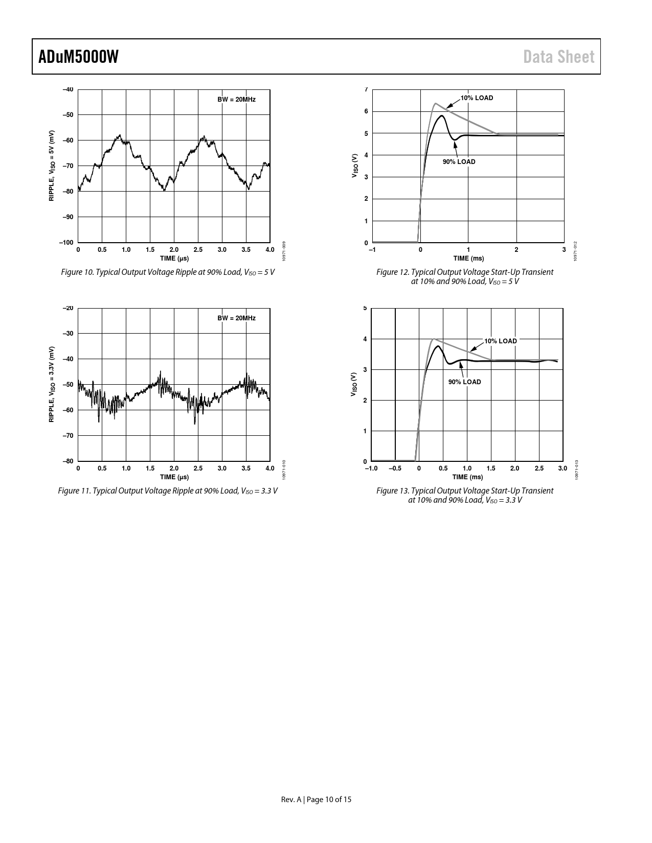 10971- Figure 10. Typical Output Voltage Ripple at 90% Load, VISO = 5 V Figure 12. Typical Output Voltage Start-Up Transient at 10% and 90% Load, VISO = 5 V