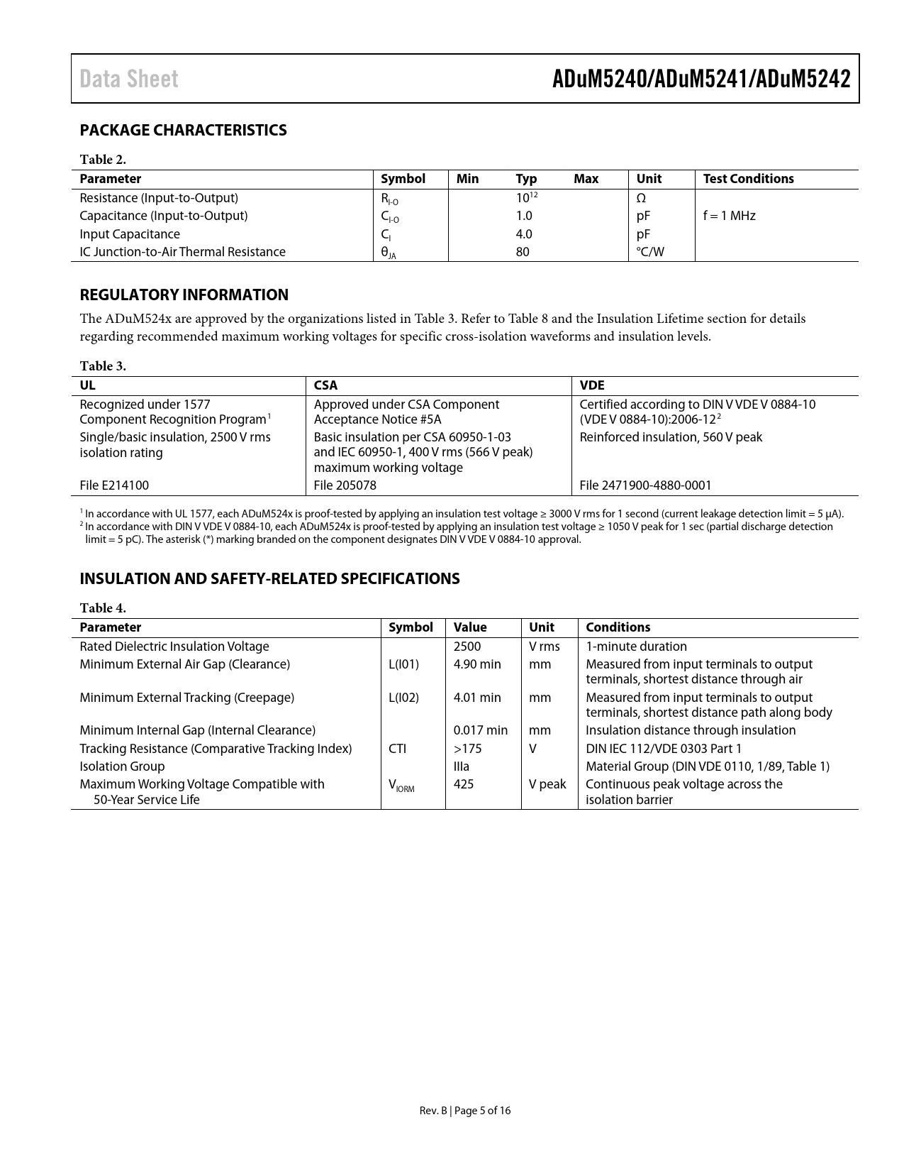 Pages / Page16 / 5 — Data Sheet. ADuM5240/ADuM5241/ADuM5242. PACKAGE CHARACTERISTICS. Table 2. …