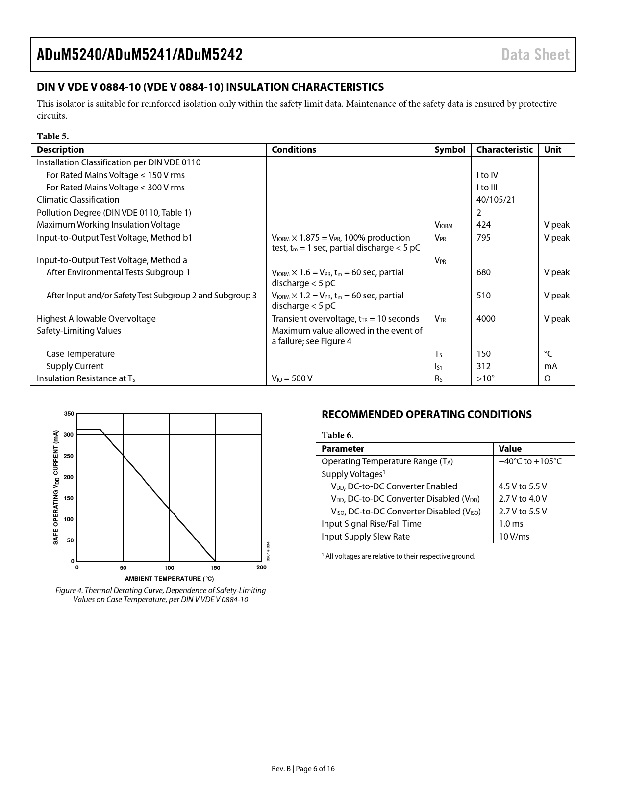 link to page 6 link to page 6 ADuM5240/ADuM5241/ADuM5242Data SheetDIN V VDE V 0884-10 (VDE V 0884-10) INSULATION CHARACTERISTICS This isolator is suitable for reinforced isolation only within the safety limit data. Maintenance of the safety data is ensured by protective circuits. Table 5. Description ConditionsSymbolCharacteristicUnit Installation Classification per DIN VDE 0110 For Rated Mains Voltage ≤ 150 V rms I to IV For Rated Mains Voltage ≤ 300 V rms I to III Climatic Classification 40/105/21 Pollution Degree (DIN VDE 0110, Table 1) 2 Maximum Working Insulation Voltage VIORM 424 V peak Input-to-Output Test Voltage, Method b1 VIORM × 1.875 = VPR, 100% production VPR 795 V peak test, tm = 1 sec, partial discharge < 5 pC Input-to-Output Test Voltage, Method a VPR After Environmental Tests Subgroup 1 VIORM × 1.6 = VPR, tm = 60 sec, partial 680 V peak discharge < 5 pC After Input and/or Safety Test Subgroup 2 and Subgroup 3 VIORM × 1.2 = VPR, tm = 60 sec, partial 510 V peak discharge < 5 pC Highest Allowable Overvoltage Transient overvoltage, tTR = 10 seconds VTR 4000 V peak Safety-Limiting Values Maximum value allowed in the event of a failure; see Figure 4 Case Temperature TS 150 °C Supply Current IS1 312 mA Insulation Resistance at TS VIO = 500 V RS >109 Ω 350RECOMMENDED OPERATING CONDITIONSA)300Table 6.(mParameter ValueNT250 Operating Temperature Range (TA) −40°C to +105°C CURRE Supply Voltages1 200DDV VDD, DC-to-DC Converter Enabled 4.5 V to 5.5 V G IN150 V T DD, DC-to-DC Converter Disabled (VDD) 2.7 V to 4.0 V A VISO, DC-to-DC Converter Disabled (VISO) 2.7 V to 5.5 V PER100 Input Signal Rise/Fall Time 1.0 ms E O F Input Supply Slew Rate 10 V/ms SA50 04 0 4- 1 601 All voltages are relative to their respective ground. 0 0 050100150200AMBIENT TEMPERATURE (°C) Figure 4. Thermal Derating Curve, Dependence of Safety-Limiting Values on Case Temperature, per DIN V VDE V 0884-10 Rev. B | Page 6 of 16 Document Outline Features General Description Functional Block Diagrams Table of Contents Revision History Specifications Electrical Characteristics Package Characteristics Regulatory Information Insulation and Safety-Related Specifications DIN V VDE V 0884-10 (VDE V 0884-10) Insulation Characteristics Recommended Operating Conditions Absolute Maximum Ratings ESD Caution Pin Configurations and Function Descriptions Typical Performance Characteristics Applications Information DC-to-DC Converter Propagation Delay-Related Parameters DC Correctness and Magnetic Field Immunity Thermal Analysis PCB Layout Increasing Available Power Insulation Lifetime Outline Dimensions Ordering Guide