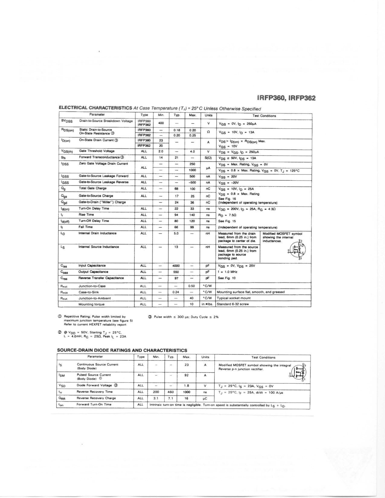 Pages / Page2 / 2 — IRFP360, IRFP362. ELECTRICAL CHARACTERISTICS At Case Temperature (Tj) = …