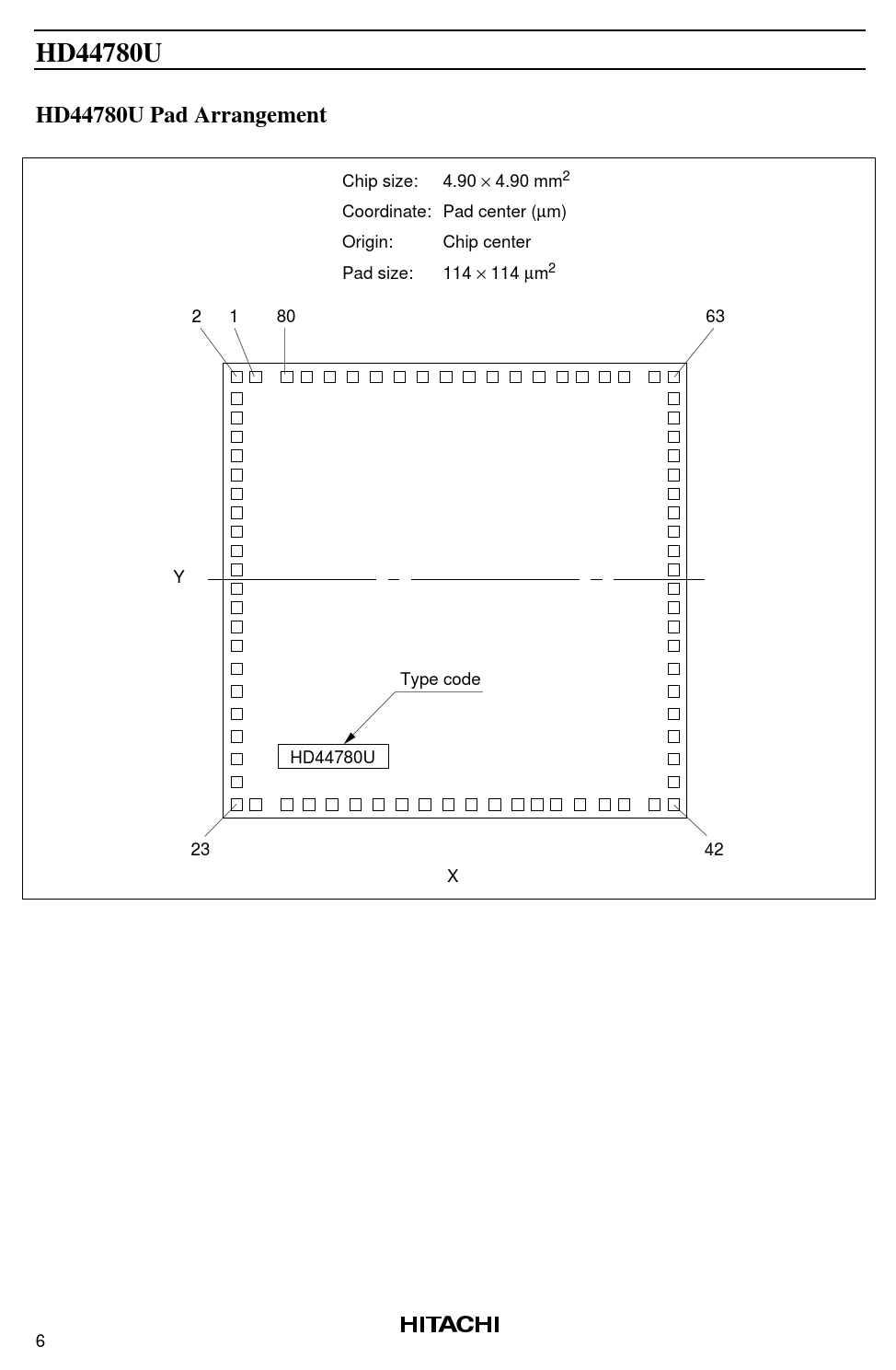 Chip size: 4.90 × 4.90 mm2 Coordinate: Pad center (µm) Origin: Chip center Pad size: 114 × 114 µm2 2 1 80 63 Y Type code HD44780U 23 42 X 6 Document Outline Description Features Ordering Information HD44780U Block Diagram HD44780U Pin Arrangement (FP-80B) HD44780U Pin Arrangement (TFP-80F) HD44780U Pad Arrangement HD44780U Pad Location Coordinates Pin Functions Function Description Interfacing to the MPU Reset Function Instructions Instruction Description Interfacing the HD44780U Power Supply for Liquid Crystal Display Drive Relationship between Oscillation Frequency and Liquid Crystal Display Frame Frequency Instruction and Display Correspondence Initializing by Instruction Absolute Maximum Ratings DC Characteristics AC Characteristics Bus Timing Characteristics Interface Timing Characteristics with External Driver Power Supply Conditions Using Internal Reset Circuit DC Characteristics AC Characteristics Bus Timing Characteristics Interface Timing Characteristics with External Driver Power Supply Conditions Using Internal Reset Circuit Electrical Characteristics Notes Load Circuits Timing Characteristics