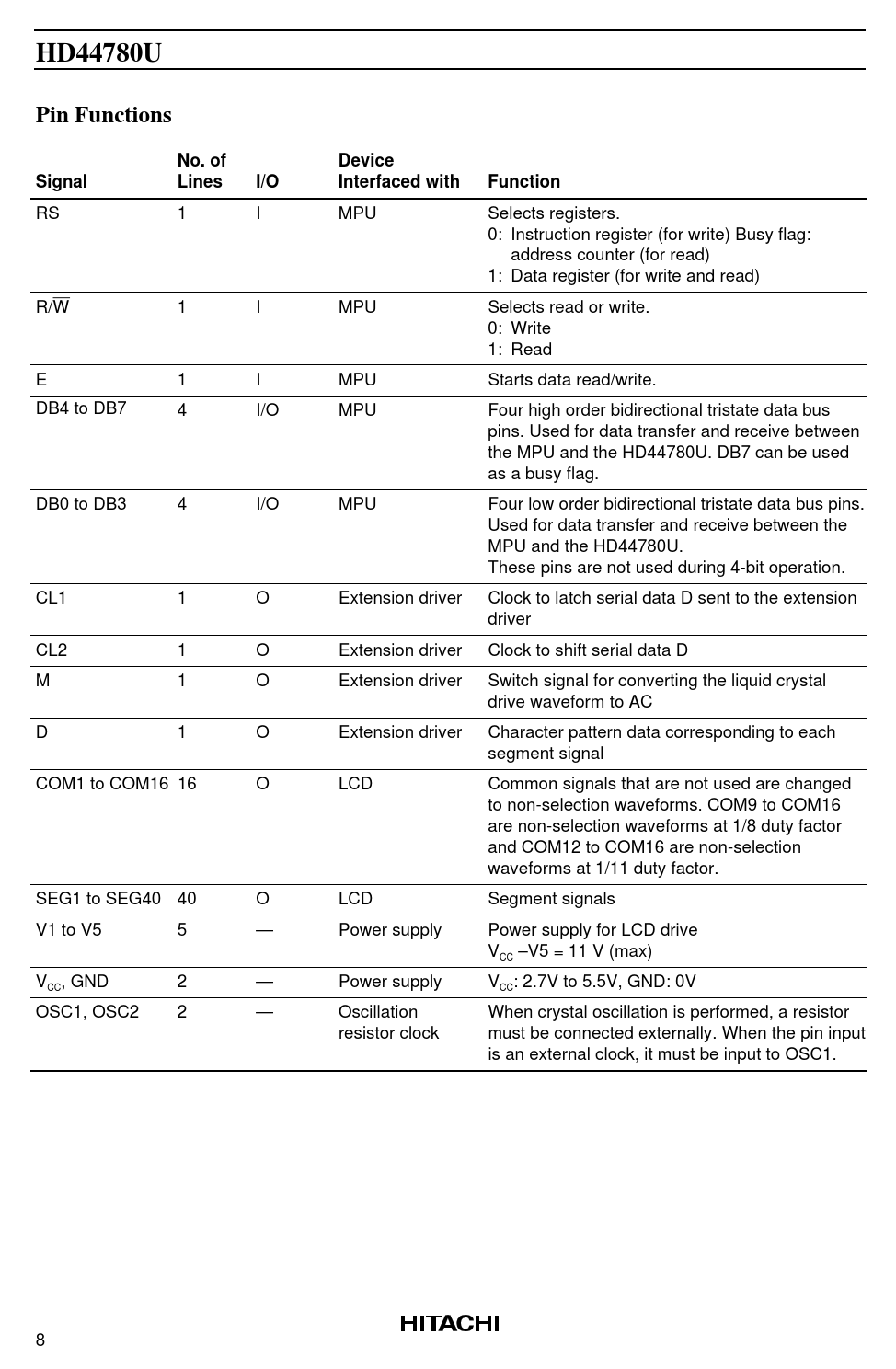HD44780UPin FunctionsNo. ofDeviceSignalLinesI/OInterfaced withFunction RS 1 I MPU Selects registers. 0: Instruction register (for write) Busy flag: address counter (for read) 1: Data register (for write and read) R/W 1 I MPU Selects read or write. 0: Write 1: Read E 1 I MPU Starts data read/write. DB4 to DB7 4 I/O MPU Four high order bidirectional tristate data bus pins. Used for data transfer and receive between the MPU and the HD44780U. DB7 can be used as a busy flag. DB0 to DB3 4 I/O MPU Four low order bidirectional tristate data bus pins. Used for data transfer and receive between the MPU and the HD44780U. These pins are not used during 4-bit operation. CL1 1 O Extension driver Clock to latch serial data D sent to the extension driver CL2 1 O Extension driver Clock to shift serial data D M 1 O Extension driver Switch signal for converting the liquid crystal drive waveform to AC D 1 O Extension driver Character pattern data corresponding to each segment signal COM1 to COM16 16 O LCD Common signals that are not used are changed to non-selection waveforms. COM9 to COM16 are non-selection waveforms at 1/8 duty factor and COM12 to COM16 are non-selection waveforms at 1/11 duty factor. SEG1 to SEG40 40 O LCD Segment signals V1 to V5 5 — Power supply Power supply for LCD drive V –V5 = 11 V (max) CC V , GND 2 — Power supply V : 2.7V to 5.5V, GND: 0V CC CC OSC1, OSC2 2 — Oscillation When crystal oscillation is performed, a resistor resistor clock must be connected externally. When the pin input is an external clock, it must be input to OSC1. 8 Document Outline Description Features Ordering Information HD44780U Block Diagram HD44780U Pin Arrangement (FP-80B) HD44780U Pin Arrangement (TFP-80F) HD44780U Pad Arrangement HD44780U Pad Location Coordinates Pin Functions Function Description Interfacing to the MPU Reset Function Instructions Instruction Description Interfacing the HD44780U Power Supply for Liquid Crystal Display Drive Relationship between Oscillation Frequency and Liquid Crystal Display Frame Frequency Instruction and Display Correspondence Initializing by Instruction Absolute Maximum Ratings DC Characteristics AC Characteristics Bus Timing Characteristics Interface Timing Characteristics with External Driver Power Supply Conditions Using Internal Reset Circuit DC Characteristics AC Characteristics Bus Timing Characteristics Interface Timing Characteristics with External Driver Power Supply Conditions Using Internal Reset Circuit Electrical Characteristics Notes Load Circuits Timing Characteristics