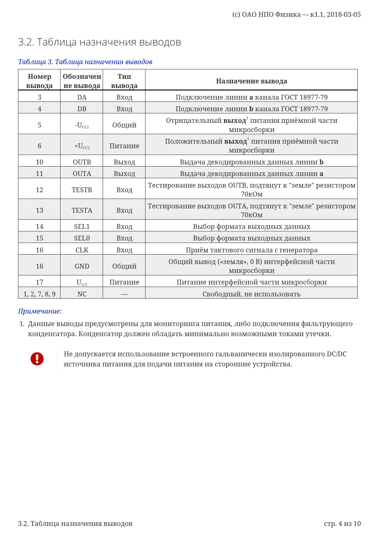(c) ОАО НПО Физика — к1.1, 2018-03-05 3.2. Таблица назначения выводов Таблица 3. Таблица назначения выводов