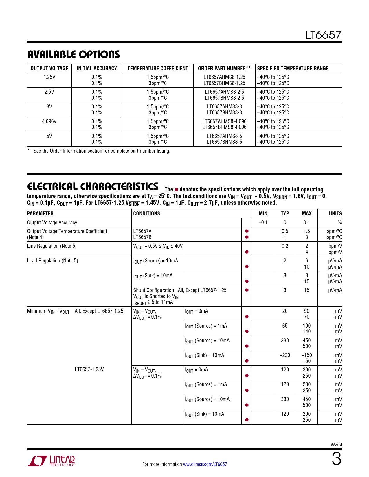Output Voltage Accuracy –0.1 0 0.1 % Output Voltage Temperature Coefficient LT6657A l 0.5 1.5 ppm/°C (Note 4) LT6657B l 1 3 ppm/°C Line Regulation (Note 5) VOUT + 0.5V ≤ VIN ≤ 40V 0.2 2 ppm/V l 4 ppm/V Load Regulation (Note 5) IOUT (Source) = 10mA 2 6 µV/mA l 10 µV/mA IOUT (Sink) = 10mA 3 8 µV/mA l 15 µV/mA Shunt Configuration All, Except LT6657-1.25 l 3 15 µV/mA VOUT Is Shorted to VIN ISHUNT 2.5 to 11mA Minimum VIN – VOUT All, Except LT6657-1.25 VIN – VOUT, IOUT = 0mA 20 50 mV ΔVOUT = 0.1% l 70 mV IOUT (Source) = 1mA 65 100 mV l 140 mV IOUT (Source) = 10mA 330 450 mV l 500 mV IOUT (Sink) = 10mA –230 –150 mV l –50 mV LT6657-1.25V VIN – VOUT, IOUT = 0mA 120 200 mV ΔVOUT = 0.1% l 250 mV IOUT (Source) = 1mA 120 200 mV l 250 mV IOUT (Source) = 10mA 330 450 mV l 500 mV IOUT (Sink) = 10mA 120 200 mV l 250 mV 6657fd For more information www.linear.com/LT6657 3