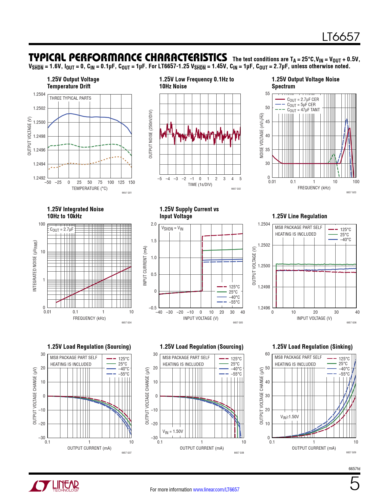 Typical perForMance characTerisTics The test conditions are TA = 25°C,VIN = VOUT + 0.5V, VSHDN = 1.6V, IOUT = 0, CIN = 0.1µF, COUT = 1µF. For LT6657-1.25 VSHDN = 1.45V, CIN = 1µF, COUT = 2.7µF, unless otherwise noted. 1.25V Output Voltage 1.25V Low Frequency 0.1Hz to 1.25V Output Voltage Noise Temperature Drift 10Hz Noise Spectrum