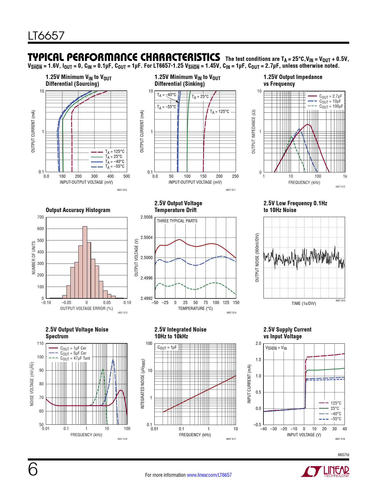 Typical perForMance characTerisTics The test conditions are TA = 25°C,VIN = VOUT + 0.5V, VSHDN = 1.6V, IOUT = 0, CIN = 0.1µF, COUT = 1µF. For LT6657-1.25 VSHDN = 1.45V, CIN = 1µF, COUT = 2.7µF, unless otherwise noted. 1.25V Minimum VIN to VOUT 1.25V Minimum VIN to VOUT 1.25V Output Impedance Differential (Sourcing) Differential (Sinking) vs Frequency