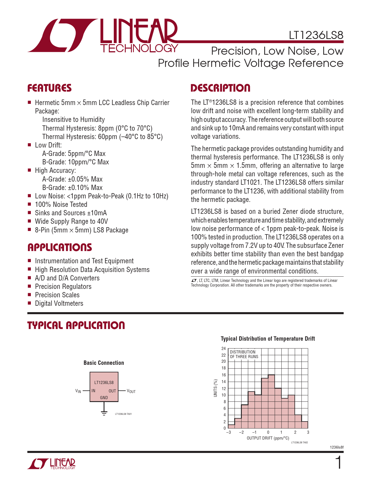 LT1236LS8 Precision, Low Noise, Low Profile Hermetic Voltage Reference FeaTuresDescripTion n Hermetic 5mm × 5mm LCC Leadless Chip Carrier The LT®1236LS8 is a precision reference that combines Package: low drift and noise with excellent long-term stability and Insensitive to Humidity high output accuracy. The reference output will both source Thermal Hysteresis: 8ppm (0°C to 70°C) and sink up to 10mA and remains very constant with input Thermal Hysteresis: 60ppm (–40°C to 85°C) voltage variations. n Low Drift: The hermetic package provides outstanding humidity and A-Grade: 5ppm/°C Max thermal hysteresis performance. The LT1236LS8 is only B-Grade: 10ppm/°C Max 5mm × 5mm × 1.5mm, offering an alternative to large n High Accuracy: through-hole metal can voltage references, such as the A-Grade: ±0.05% Max industry standard LT1021. The LT1236LS8 offers similar B-Grade: ±0.10% Max performance to the LT1236, with additional stability from n Low Noise: <1ppm Peak-to-Peak (0.1Hz to 10Hz) the hermetic package. n 100% Noise Tested n Sinks and Sources ±10mA LT1236LS8 is based on a buried Zener diode structure, n Wide Supply Range to 40V which enables temperature and time stability, and extremely n 8-Pin (5mm × 5mm) LS8 Package low noise performance of < 1ppm peak-to-peak. Noise is 100% tested in production. The LT1236LS8 operates on a supply voltage from 7.2V up to 40V. The subsurface Zener applicaTions exhibits better time stability than even the best bandgap n Instrumentation and Test Equipment reference, and the hermetic package maintains that stability n High Resolution Data Acquisition Systems over a wide range of environmental conditions. n A/D and D/A Converters L, LT, LTC, LTM, Linear Technology and the Linear logo are registered trademarks of Linear n Technology Corporation. All other trademarks are the property of their respective owners. Precision Regulators n Precision Scales n Digital Voltmeters Typical applicaTionTypical Distribution of Temperature Drift 24 DISTRIBUTION 22 OF THREE RUNS Basic Connection 20 18 16 LT1236LS8 14 V 12 IN IN OUT VOUT 10 GND UNITS (%) 8 6 LT1236LS8 TA01 4 2 0 –3 –2 –1 0 1 2 3 OUTPUT DRIFT (ppm/°C) LT1236LS8 TA02 1236ls8f 1 Document Outline Features Applications Description Typical Application Absolute Maximum Ratings Pin Configuration Order Information Electrical Characteristics Typical Performance Characteristics Pin Functions Block Diagram Applications Information Typical Applications Package Description Typical Application Related Parts