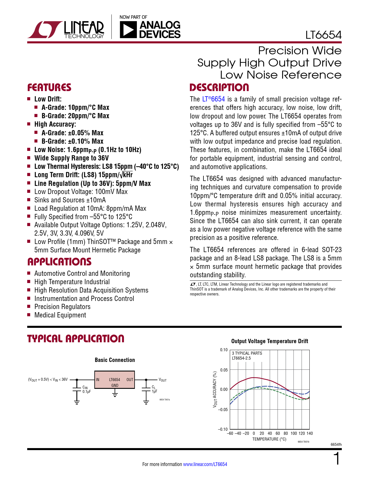 LT6654 Precision Wide Supply High Output Drive Low Noise Reference FeaTuresDescripTion n Low Drift: The LT®6654 is a family of small precision voltage ref- n A-Grade: 10ppm/°C Max erences that offers high accuracy, low noise, low drift, n B-Grade: 20ppm/°C Max low dropout and low power. The LT6654 operates from n High Accuracy: voltages up to 36V and is fully specified from –55°C to n A-Grade: ±0.05% Max 125°C. A buffered output ensures ±10mA of output drive n B-Grade: ±0.10% Max with low output impedance and precise load regulation. n Low Noise: 1.6ppmP-P (0.1Hz to 10Hz) These features, in combination, make the LT6654 ideal n Wide Supply Range to 36V for portable equipment, industrial sensing and control, n Low Thermal Hysteresis: LS8 15ppm (–40°C to 125°C) and automotive applications. n Long Term Drift: (LS8) 15ppm/√kHr The LT6654 was designed with advanced manufactur- n Line Regulation (Up to 36V): 5ppm/V Max ing techniques and curvature compensation to provide n Low Dropout Voltage: 100mV Max 10ppm/°C temperature drift and 0.05% initial accuracy. n Sinks and Sources ±10mA Low thermal hysteresis ensures high accuracy and n Load Regulation at 10mA: 8ppm/mA Max 1.6ppm n P-P noise minimizes measurement uncertainty. Fully Specified from –55°C to 125°C Since the LT6654 can also sink current, it can operate n Available Output Voltage Options: 1.25V, 2.048V, as a low power negative voltage reference with the same 2.5V, 3V, 3.3V, 4.096V, 5V precision as a positive reference. n Low Profile (1mm) ThinSOT™ Package and 5mm × 5mm Surface Mount Hermetic Package The LT6654 references are offered in 6-lead SOT-23 package and an 8-lead LS8 package. The LS8 is a 5mm applicaTions × 5mm surface mount hermetic package that provides n Automotive Control and Monitoring outstanding stability. n High Temperature Industrial L, LT, LTC, LTM, Linear Technology and the Linear logo are registered trademarks and n ThinSOT is a trademark of Analog Devices, Inc. All other trademarks are the property of their High Resolution Data Acquisition Systems respective owners. n Instrumentation and Process Control n Precision Regulators n Medical Equipment Typical applicaTionOutput Voltage Temperature Drift 0.10 3 TYPICAL PARTS Basic Connection LT6654-2.5 0.05 (VOUT + 0.5V) < VIN < 36V IN LT6654 OUT VOUT C GND IN CL 0.1µF 1µF 0.00 ACCURACY (%) 6654 TA01a V OUT –0.05 –0.10–60 –40 –20 0 20 40 60 80 100 120 140 TEMPERATURE (°C) 6654 TA01b 6654fh For more information www.linear.com/LT6654 1 Document Outline Features Applications Typical Application Description Absolute Maximum Ratings Pin Configuration Order Information Available Options Electrical Characteristics Typical Performance Characteristics Pin Functions Block Diagrams Applications Information Typical Applications Package Description Revision History Typical Application Related Parts