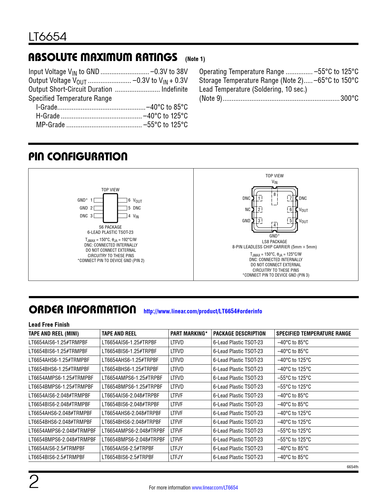orDer inForMaTion http://www.linear.com/product/LT6654#orderinfo Lead Free Finish TAPE AND REEL (MINI) TAPE AND REEL PART MARKING* PACKAGE DESCRIPTION SPECIFIED TEMPERATURE RANGE