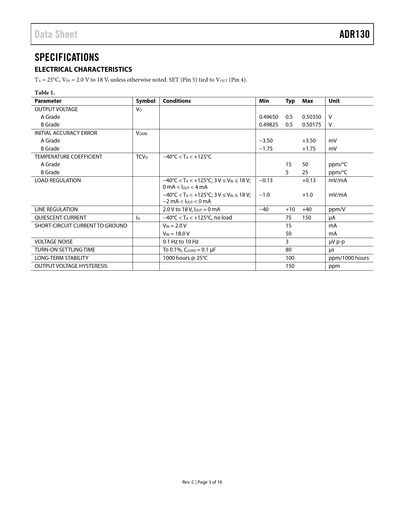 Pages / Page16 / 3 — Data Sheet. ADR130. SPECIFICATIONS ELECTRICAL CHARACTERISTICS. Table 1. …