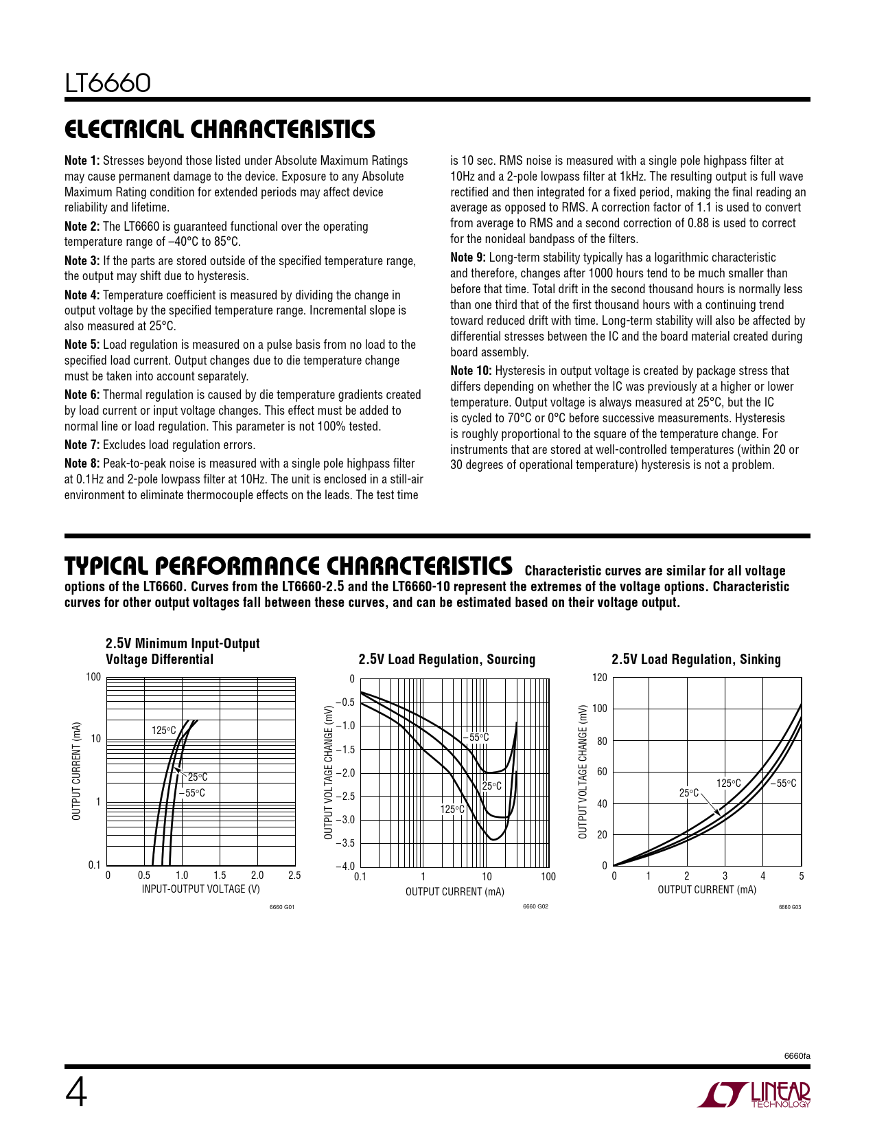 LT6660 ELECTRICAL CHARACTERISTICS Note 1: Stresses beyond those listed under Absolute Maximum Ratings is 10 sec. RMS noise is measured with a single pole highpass filter at may cause permanent damage to the device. Exposure to any Absolute 10Hz and a 2-pole lowpass filter at 1kHz. The resulting output is full wave Maximum Rating condition for extended periods may affect device rectified and then integrated for a fixed period, making the final reading an reliability and lifetime. average as opposed to RMS. A correction factor of 1.1 is used to convert Note 2: The LT6660 is guaranteed functional over the operating from average to RMS and a second correction of 0.88 is used to correct temperature range of –40°C to 85°C. for the nonideal bandpass of the filters. Note 3: If the parts are stored outside of the specified temperature range, Note 9: Long-term stability typically has a logarithmic characteristic the output may shift due to hysteresis. and therefore, changes after 1000 hours tend to be much smaller than Note 4: Temperature coefficient is measured by dividing the change in before that time. Total drift in the second thousand hours is normally less output voltage by the specified temperature range. Incremental slope is than one third that of the first thousand hours with a continuing trend also measured at 25°C. toward reduced drift with time. Long-term stability will also be affected by differential stresses between the IC and the board material created during Note 5: Load regulation is measured on a pulse basis from no load to the board assembly. specified load current. Output changes due to die temperature change must be taken into account separately. Note 10: Hysteresis in output voltage is created by package stress that differs depending on whether the IC was previously at a higher or lower Note 6: Thermal regulation is caused by die temperature gradients created temperature. Output voltage is always measured at 25°C, but the IC by load current or input voltage changes. This effect must be added to is cycled to 70°C or 0°C before successive measurements. Hysteresis normal line or load regulation. This parameter is not 100% tested. is roughly proportional to the square of the temperature change. For Note 7: Excludes load regulation errors. instruments that are stored at well-controlled temperatures (within 20 or Note 8: Peak-to-peak noise is measured with a single pole highpass filter 30 degrees of operational temperature) hysteresis is not a problem. at 0.1Hz and 2-pole lowpass filter at 10Hz. The unit is enclosed in a still-air environment to eliminate thermocouple effects on the leads. The test time WUTYPICAL PERFOR A CE CHARACTERISTICS Characteristic curves are similar for all voltageoptions of the LT6660. Curves from the LT6660-2.5 and the LT6660-10 represent the extremes of the voltage options. Characteristiccurves for other output voltages fall between these curves, and can be estimated based on their voltage output.2.5V Minimum Input-OutputVoltage Differential2.5V Load Regulation, Sourcing2.5V Load Regulation, Sinking 100 0 120 –0.5 100 –1.0 125°C 10 –55°C 80 –1.5 –2.0 60 25°C 25 125 °C °C –55°C –55°C 25°C –2.5 1 40 125°C OUTPUT CURRENT (mA) –3.0 OUTPUT VOLTAGE CHANGE (mV) OUTPUT VOLTAGE CHANGE (mV) 20 –3.5 0.1 –4.0 0 0 0.5 1.0 1.5 2.0 2.5 0.1 1 10 100 0 1 2 3 4 5 INPUT-OUTPUT VOLTAGE (V) OUTPUT CURRENT (mA) OUTPUT CURRENT (mA) 6660 G01 6660 G02 6660 G03 6660fa 4