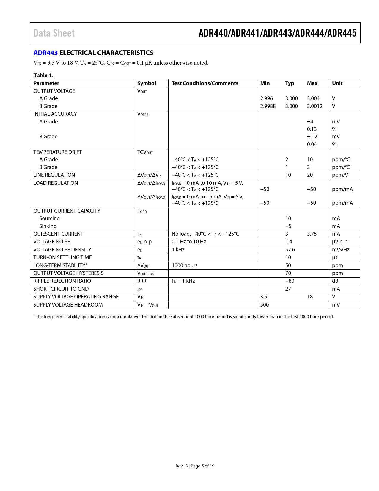 OUTPUT VOLTAGE VOUT A Grade 2.996 3.000 3.004 V B Grade 2.9988 3.000 3.0012 V INITIAL ACCURACY VOERR A Grade ±4 mV 0.13 % B Grade ±1.2 mV 0.04 % TEMPERATURE DRIFT TCVOUT A Grade −40°C < TA < +125°C 2 10 ppm/°C B Grade −40°C < TA < +125°C 1 3 ppm/°C LINE REGULATION ΔVOUT/ΔVIN −40°C < TA < +125°C 10 20 ppm/V LOAD REGULATION ΔVOUT/ΔILOAD ILOAD = 0 mA to 10 mA, VIN = 5 V, −40°C < TA < +125°C −50 +50 ppm/mA ΔVOUT/ΔILOAD ILOAD = 0 mA to −5 mA, VIN = 5 V, −40°C < TA < +125°C −50 +50 ppm/mA OUTPUT CURRENT CAPACITY ILOAD Sourcing 10 mA Sinking −5 mA QUIESCENT CURRENT IIN No load, −40°C < TA < +125°C 3 3.75 mA VOLTAGE NOISE eN p-p 0.1 Hz to 10 Hz 1.4 µV p-p VOLTAGE NOISE DENSITY eN 1 kHz 57.6 nV/√Hz TURN-ON SETTLING TIME tR 10 µs LONG-TERM STABILITY1 ∆VOUT 1000 hours 50 ppm OUTPUT VOLTAGE HYSTERESIS VOUT_HYS 70 ppm RIPPLE REJECTION RATIO RRR fIN = 1 kHz −80 dB SHORT CIRCUIT TO GND ISC 27 mA SUPPLY VOLTAGE OPERATING RANGE VIN 3.5 18 V SUPPLY VOLTAGE HEADROOM VIN − VOUT 500 mV 1 The long-term stability specification is noncumulative. The drift in the subsequent 1000 hour period is significantly lower than in the first 1000 hour period. Rev. G | Page 5 of 19 Document Outline Features Applications Pin Configurations General Description Revision History Specifications ADR440 Electrical Characteristics ADR441 Electrical Characteristics ADR443 Electrical Characteristics ADR444 Electrical Characteristics ADR445 Electrical Characteristics Absolute Maximum Ratings Thermal Resistance ESD Caution Pin Configurations and Function Descriptions Typical Performance Characteristics Theory of Operation Power Dissipation Considerations Basic Voltage Reference Connections Noise Performance Turn On Time Applications Information Output Adjustment Bipolar Outputs Programmable Voltage Source Programmable Current Source High Voltage Floating Current Source Precision Output Regulator (Boosted Reference) Outline Dimensions Ordering Guide
