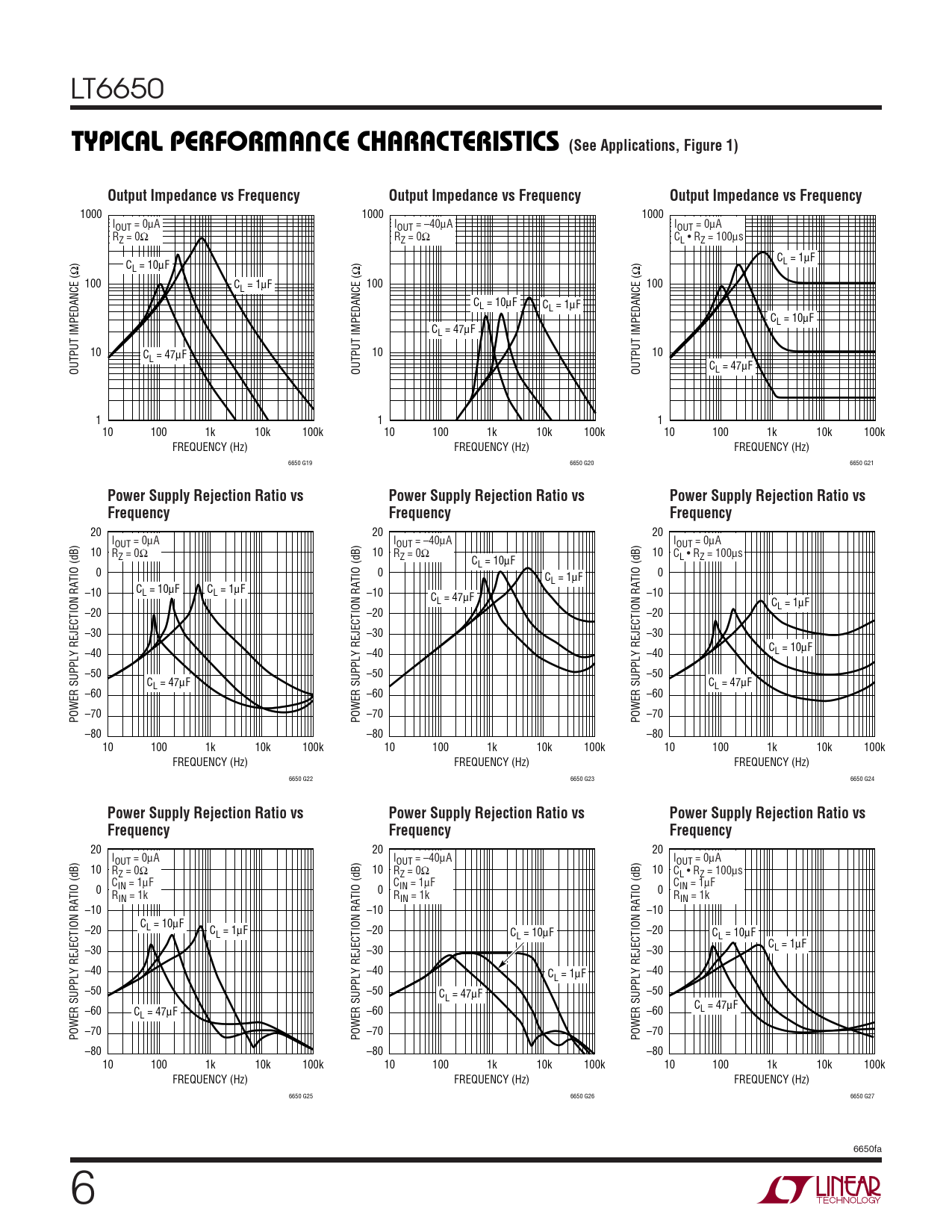 20 20 20 IOUT = 0µA IOUT = –40µA IOUT = 0µA 10 RZ = 0Ω 10 RZ = 0Ω 10 C C L • RZ = 100µs L = 10µF 0 0 C 0 L = 1µF –10 C C L = 10µF L = 1µF –10 C –10 L = 47µF CL = 1µF –20 –20 –20 –30 –30 –30 C –40 –40 –40 L = 10µF –50 –50 –50 CL = 47µF CL = 47µF –60 –60 –60 POWER SUPPLY REJECTION RATIO (dB) –70 POWER SUPPLY REJECTION RATIO (dB) –70 POWER SUPPLY REJECTION RATIO (dB) –70 –80 –80 –80 10 100 1k 10k 100k 10 100 1k 10k 100k 10 100 1k 10k 100k FREQUENCY (Hz) FREQUENCY (Hz) FREQUENCY (Hz) 6650 G22 6650 G23 6650 G24