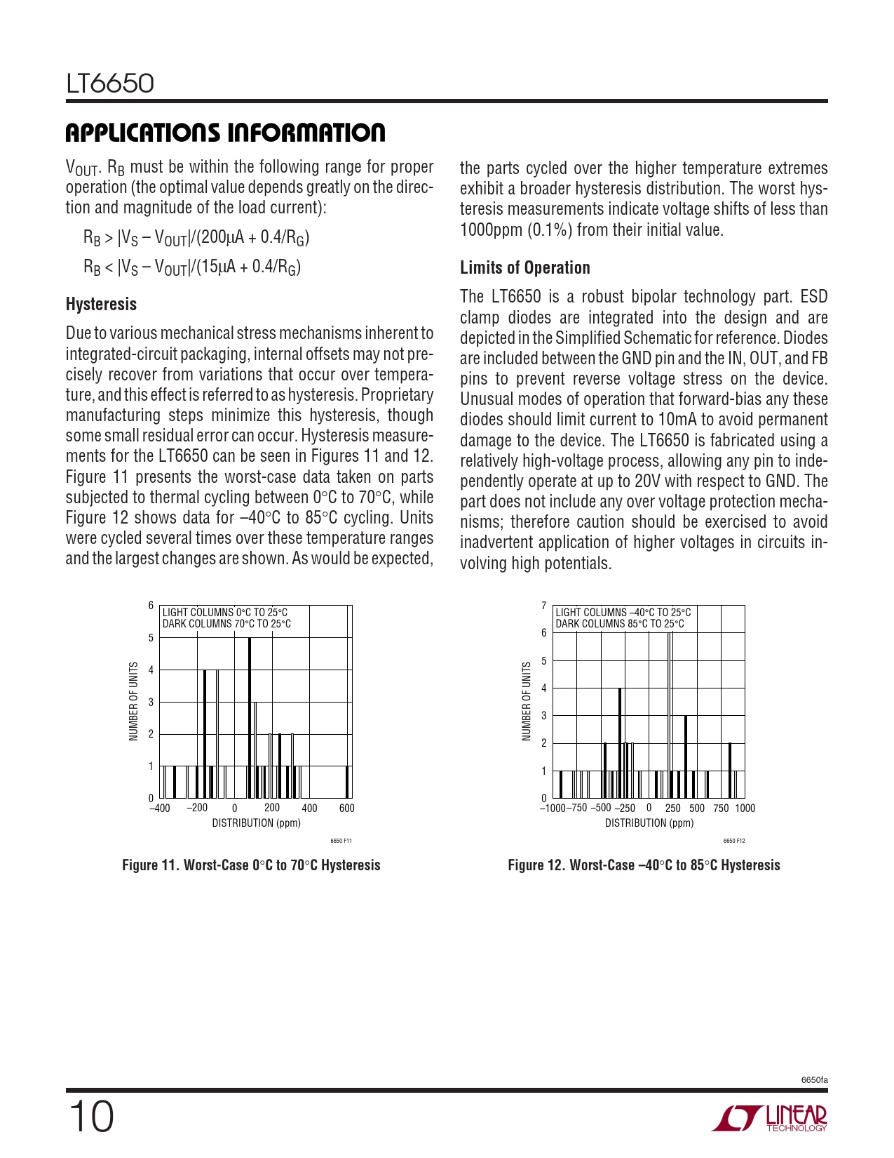 LT6650 UUWUAPPLICATIO S I FOR ATIO VOUT. RB must be within the following range for proper the parts cycled over the higher temperature extremes operation (the optimal value depends greatly on the direc- exhibit a broader hysteresis distribution. The worst hys- tion and magnitude of the load current): teresis measurements indicate voltage shifts of less than R 1000ppm (0.1%) from their initial value. B > |VS – VOUT|/(200µA + 0.4/RG) RB < |VS – VOUT|/(15µA + 0.4/RG) Limits of OperationHysteresis The LT6650 is a robust bipolar technology part. ESD clamp diodes are integrated into the design and are Due to various mechanical stress mechanisms inherent to depicted in the Simplified Schematic for reference. Diodes integrated-circuit packaging, internal offsets may not pre- are included between the GND pin and the IN, OUT, and FB cisely recover from variations that occur over tempera- pins to prevent reverse voltage stress on the device. ture, and this effect is referred to as hysteresis. Proprietary Unusual modes of operation that forward-bias any these manufacturing steps minimize this hysteresis, though diodes should limit current to 10mA to avoid permanent some small residual error can occur. Hysteresis measure- damage to the device. The LT6650 is fabricated using a ments for the LT6650 can be seen in Figures 11 and 12. relatively high-voltage process, allowing any pin to inde- Figure 11 presents the worst-case data taken on parts pendently operate at up to 20V with respect to GND. The subjected to thermal cycling between 0°C to 70°C, while part does not include any over voltage protection mecha- Figure 12 shows data for –40°C to 85°C cycling. Units nisms; therefore caution should be exercised to avoid were cycled several times over these temperature ranges inadvertent application of higher voltages in circuits in- and the largest changes are shown. As would be expected, volving high potentials. 6 7 LIGHT COLUMNS 0°C TO 25°C LIGHT COLUMNS –40°C TO 25°C DARK COLUMNS 70°C TO 25°C DARK COLUMNS 85°C TO 25°C 5 6 5 4 4 3 3 NUMBER OF UNITS 2 NUMBER OF UNITS 2 1 1 0 0 –400 –200 0 200 400 600 –1000 –750 –500 –250 0 250 500 750 1000 DISTRIBUTION (ppm) DISTRIBUTION (ppm) 6650 F11 6650 F12 Figure 11. Worst-Case 0 ° C to 70 ° C HysteresisFigure 12. Worst-Case –40 ° C to 85 ° C Hysteresis 6650fa 10