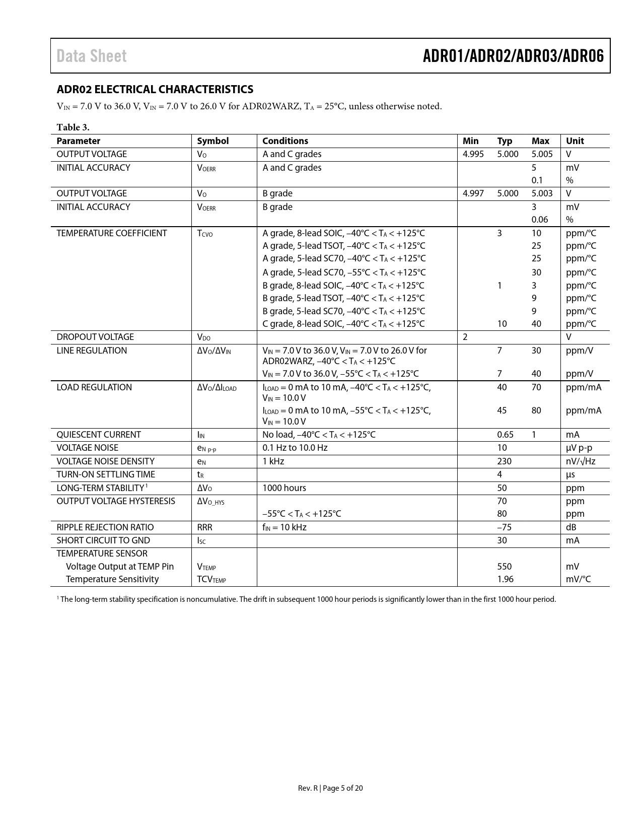 Data Sheet. ADR01/ADR02/ADR03/ADR06. ADR02 ELECTRICAL CHARACTERISTICS. Table 3. Parameter. Symbol. Conditions. Min. Typ. Max. Unit